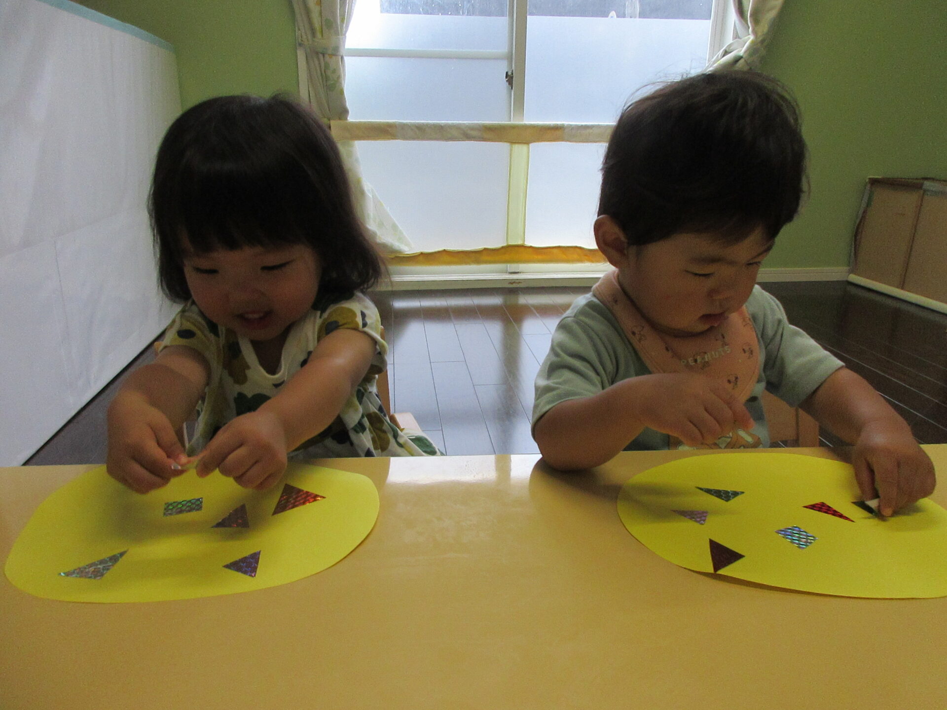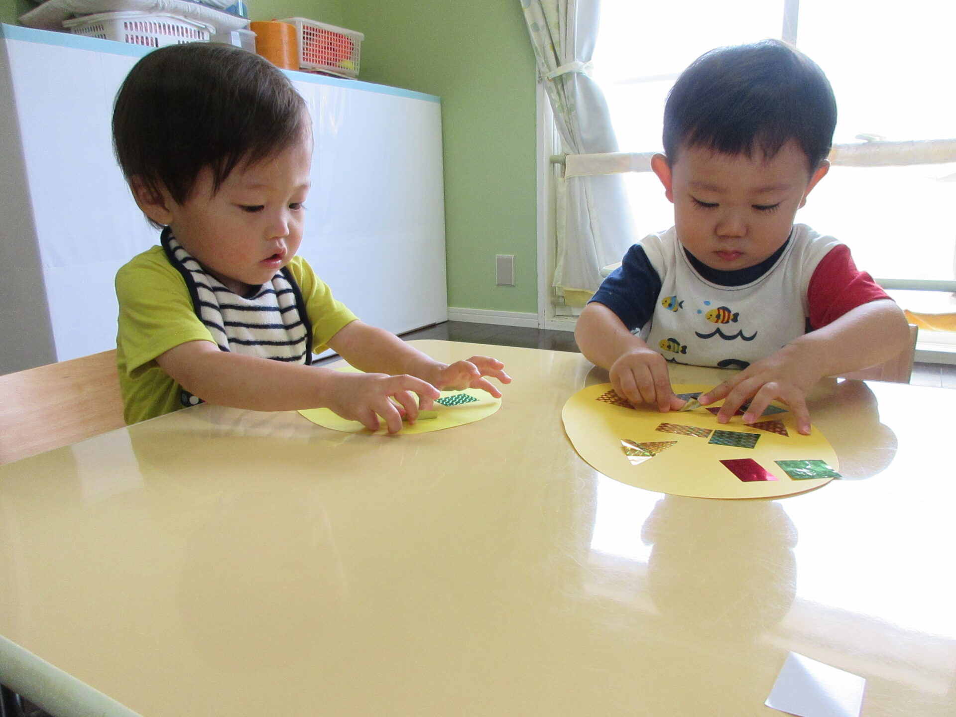 パイナップルの土台にシールを貼って模様つけをしました。かわいいサングラスも自分で貼りました。普段から大好きなシールあそび。今回はキラキラのシールを用意したので、みんな嬉しそうでした。