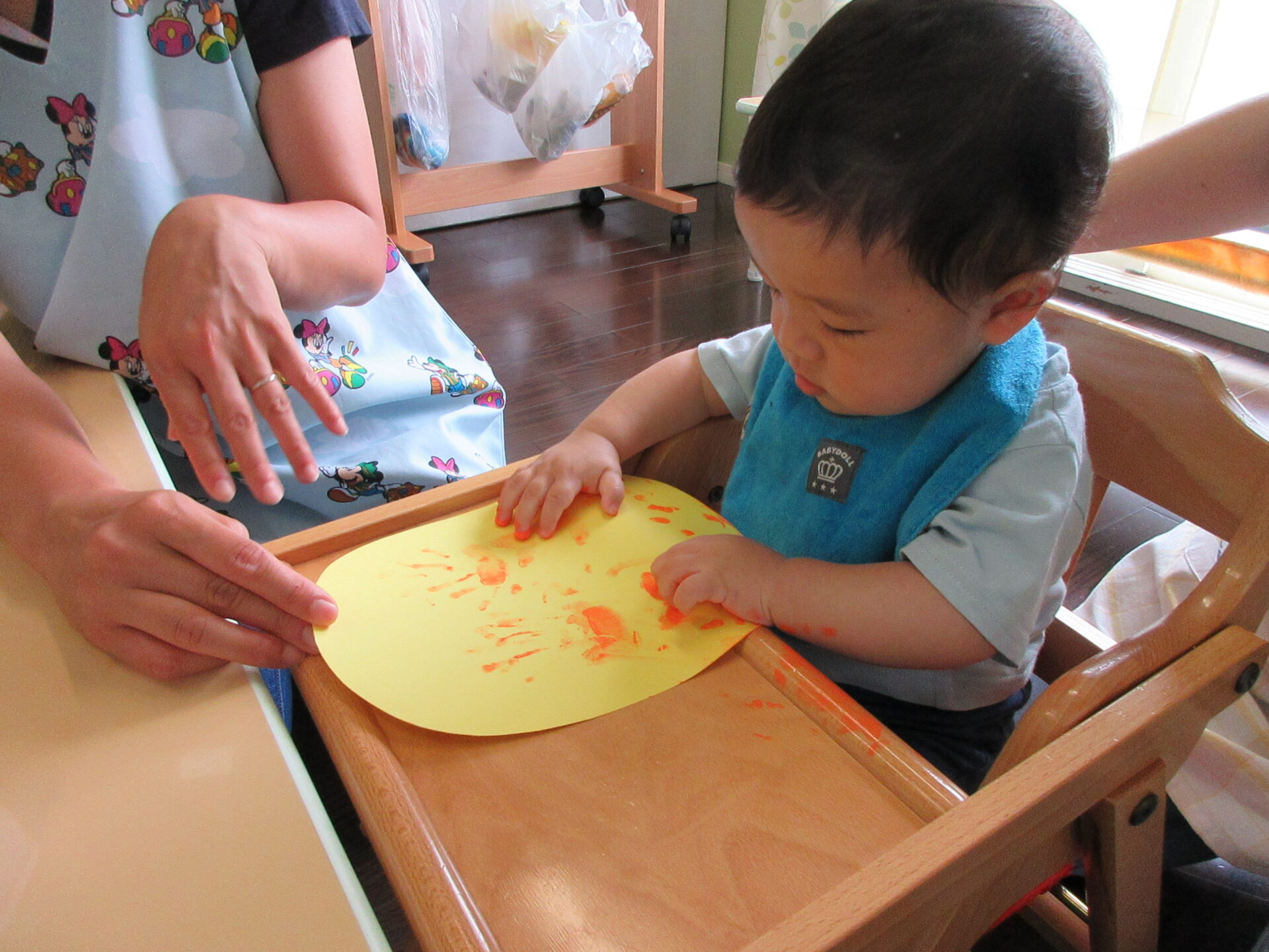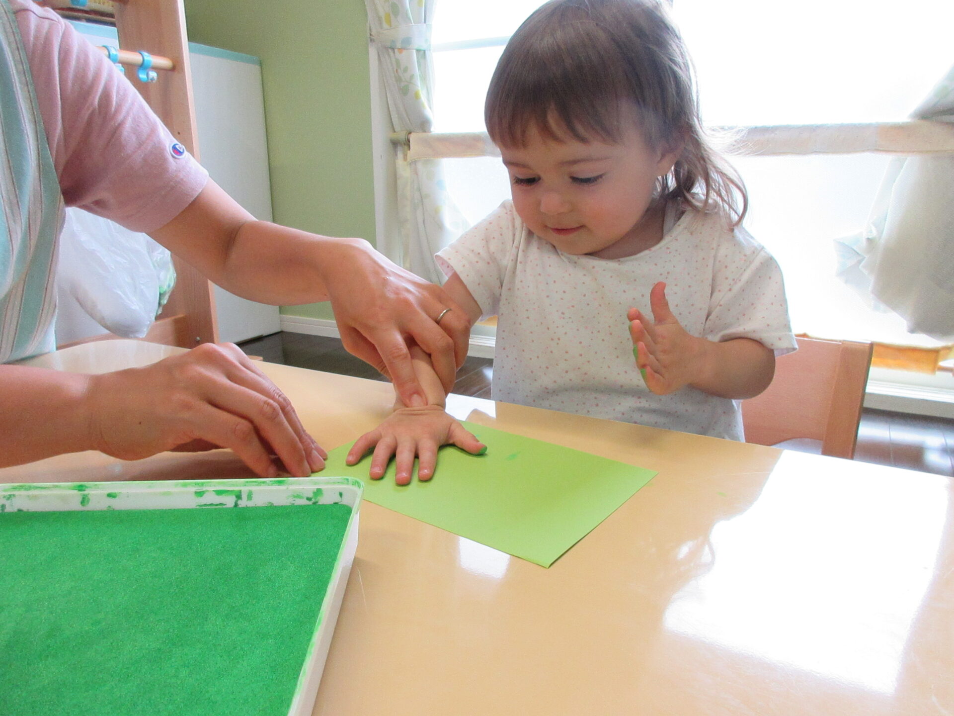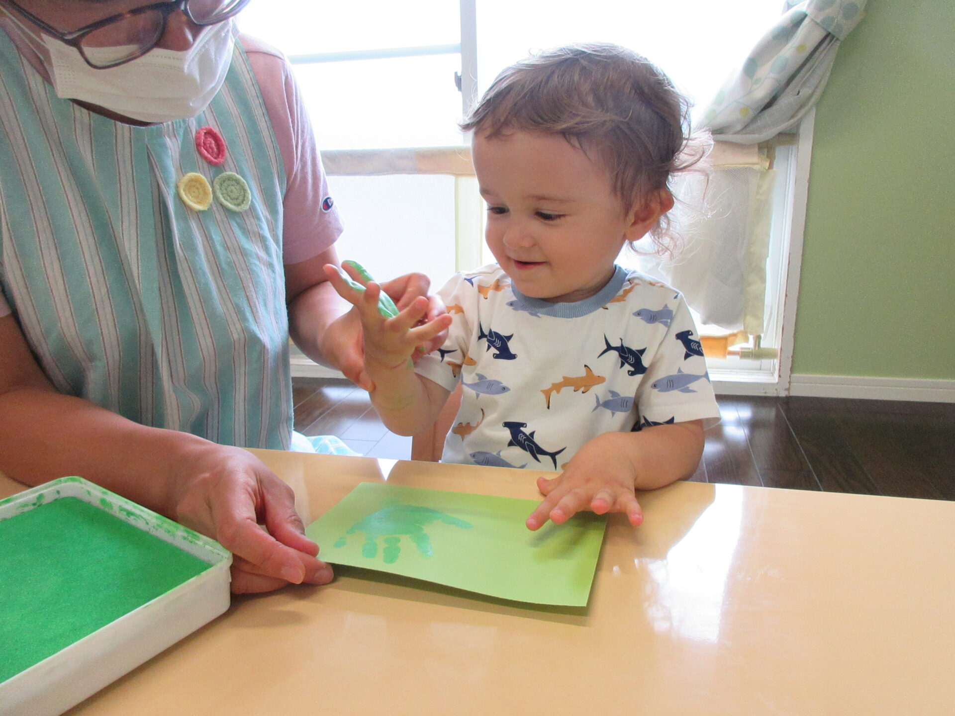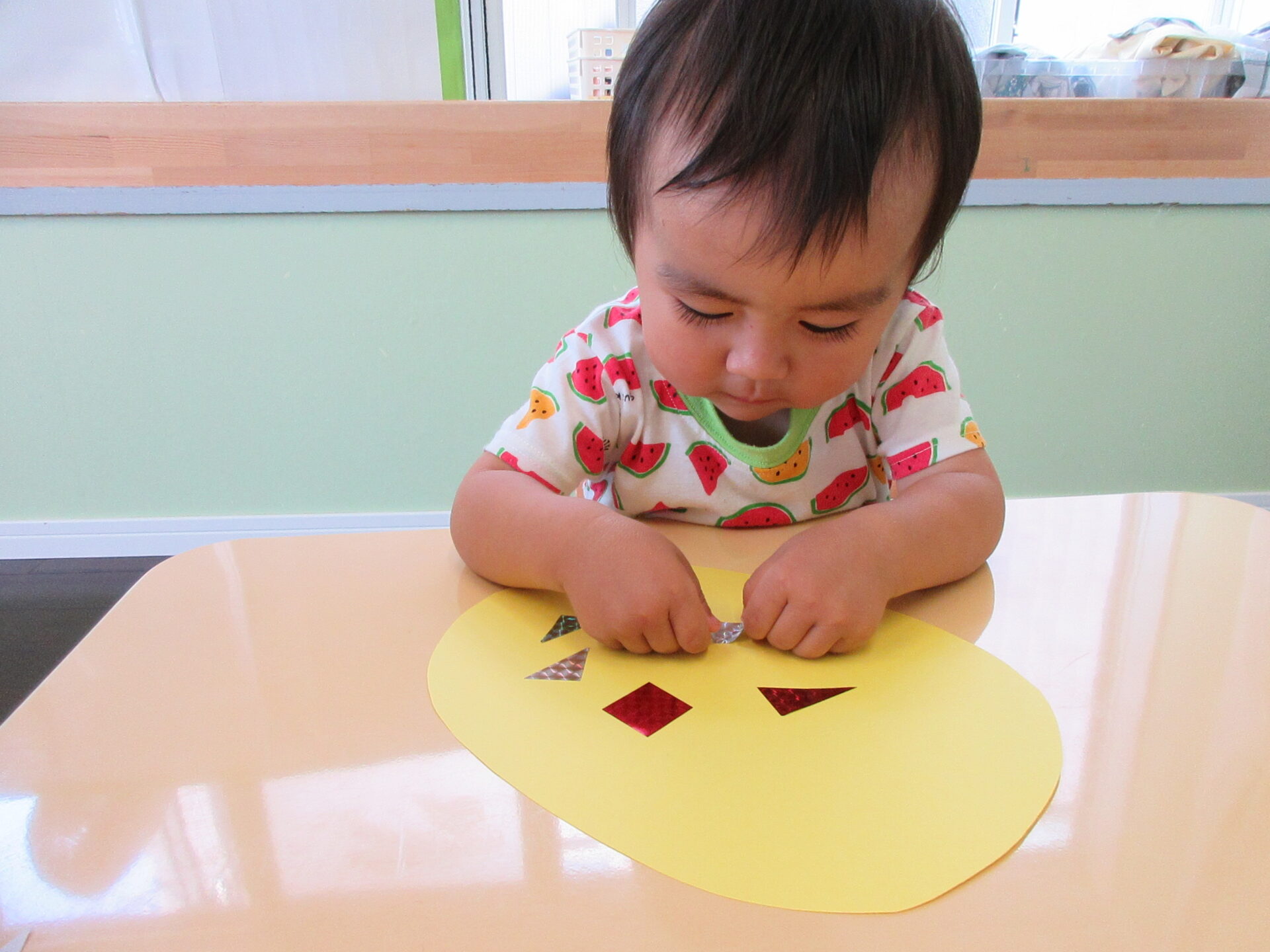パイナップルの土台は、自分の手を使ってスタンプあそびをしました。小さな手で、ぺたぺた上手に模様をつけてくれました。