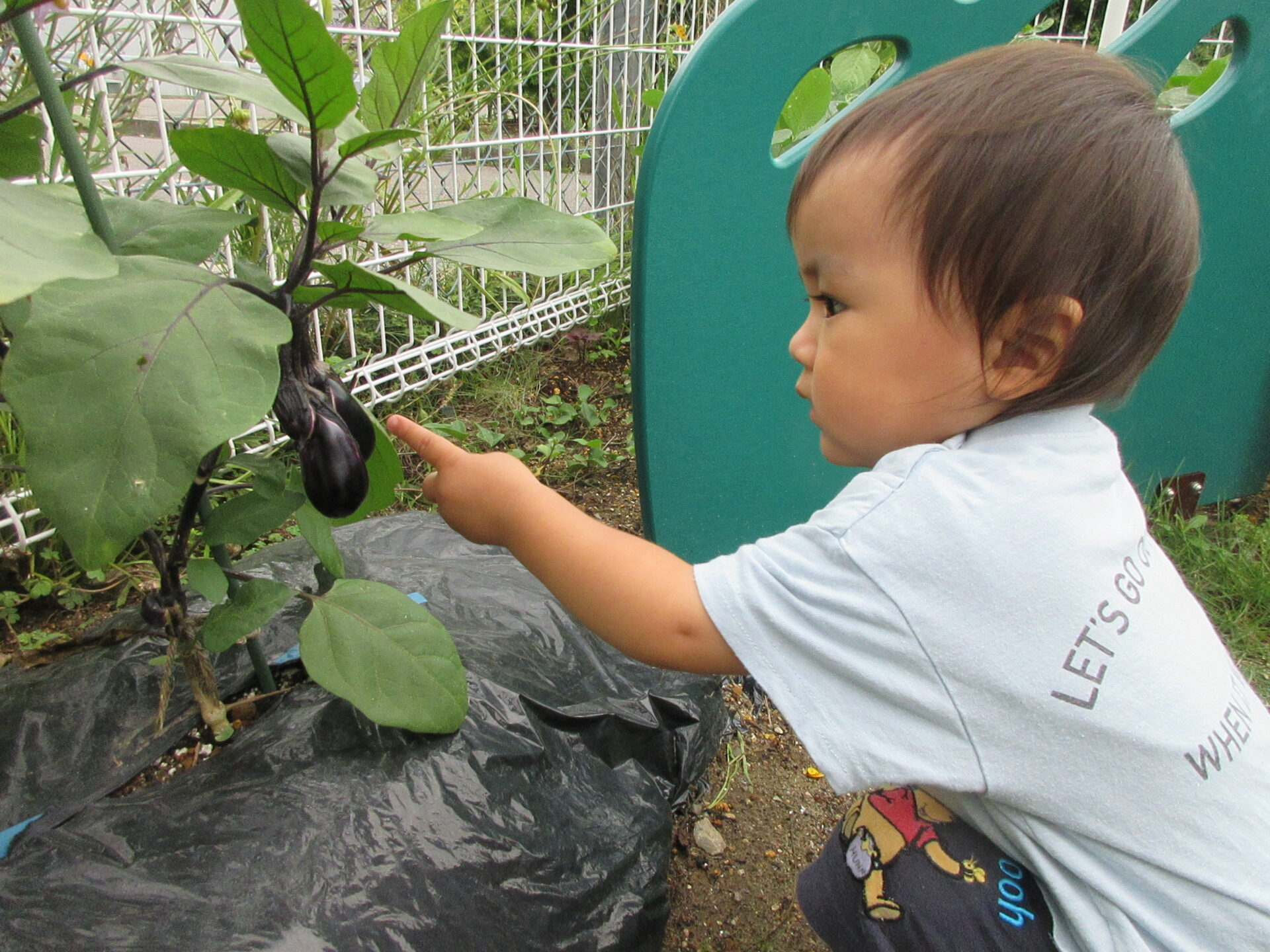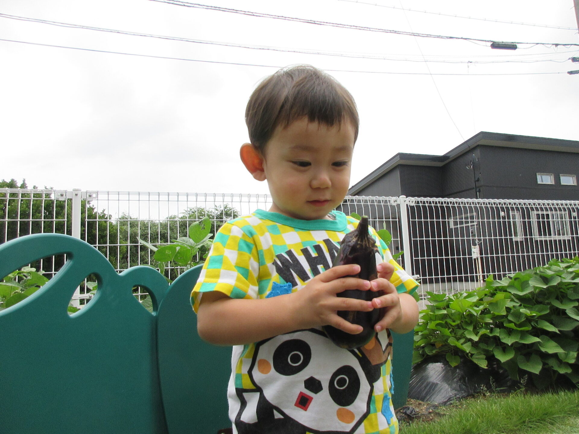 園の畑でとれたナスとピーマンを、お土産にお家に持ち帰っています。お家で料理していただき、喜んで食べてくれたお話を保護者の方から聞くことができ、私たちもとても嬉しいです。