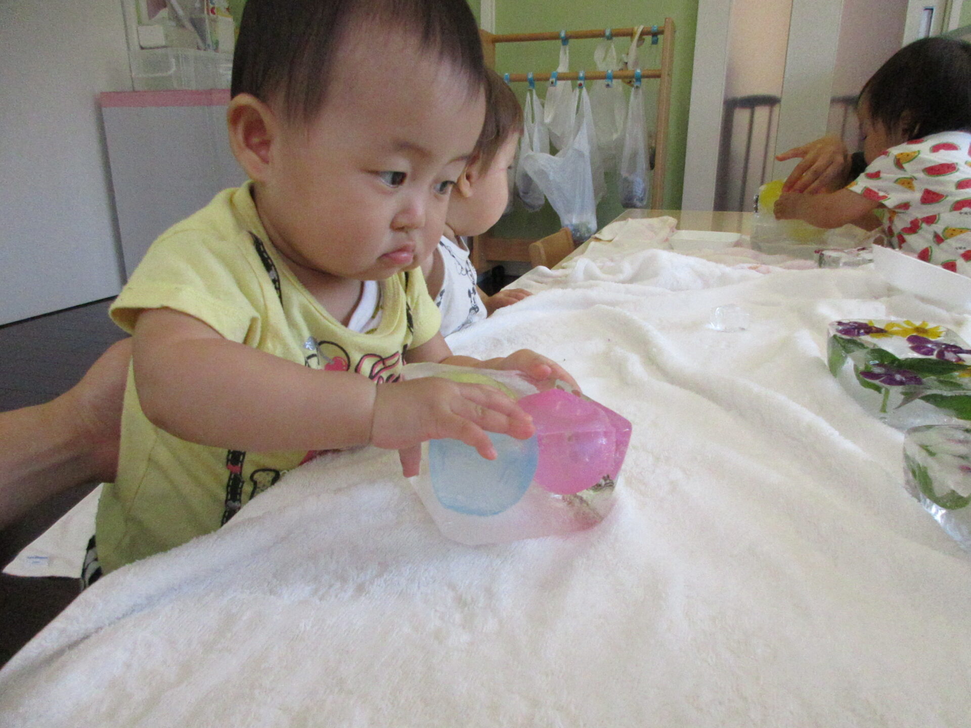 氷の冷たさに初めは驚いていたお友だちも、どんどん触ってみたり、カップに集めてみたり、あそびが広がります。丸い氷、ブロックや人形の入った氷、お花を入れて作った氷、様々な氷を触ってあそびました。