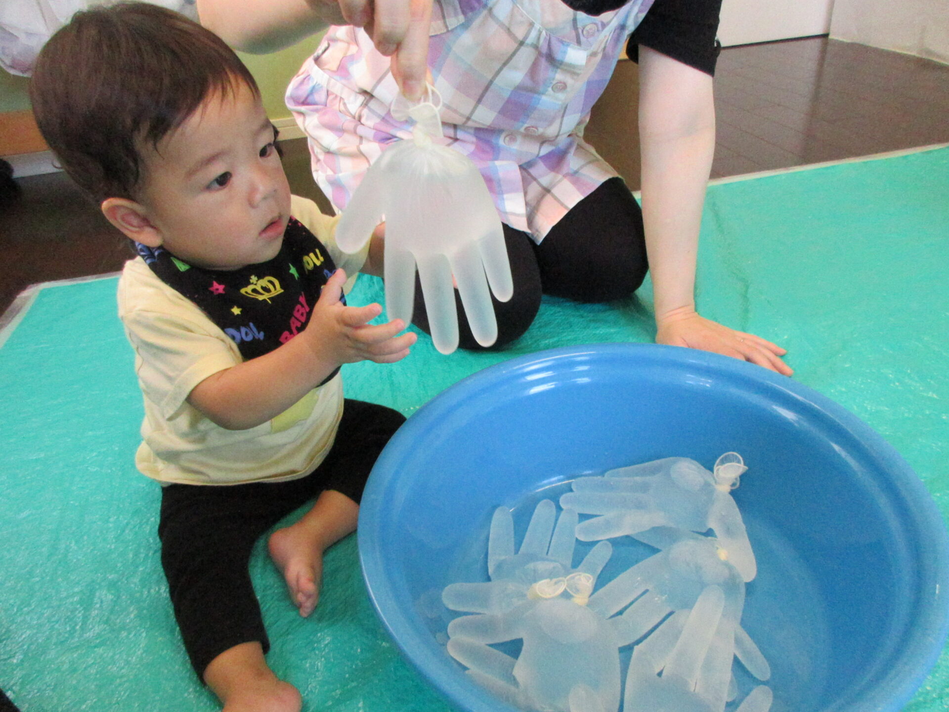 水の入った手袋を見て、びっくりー!!