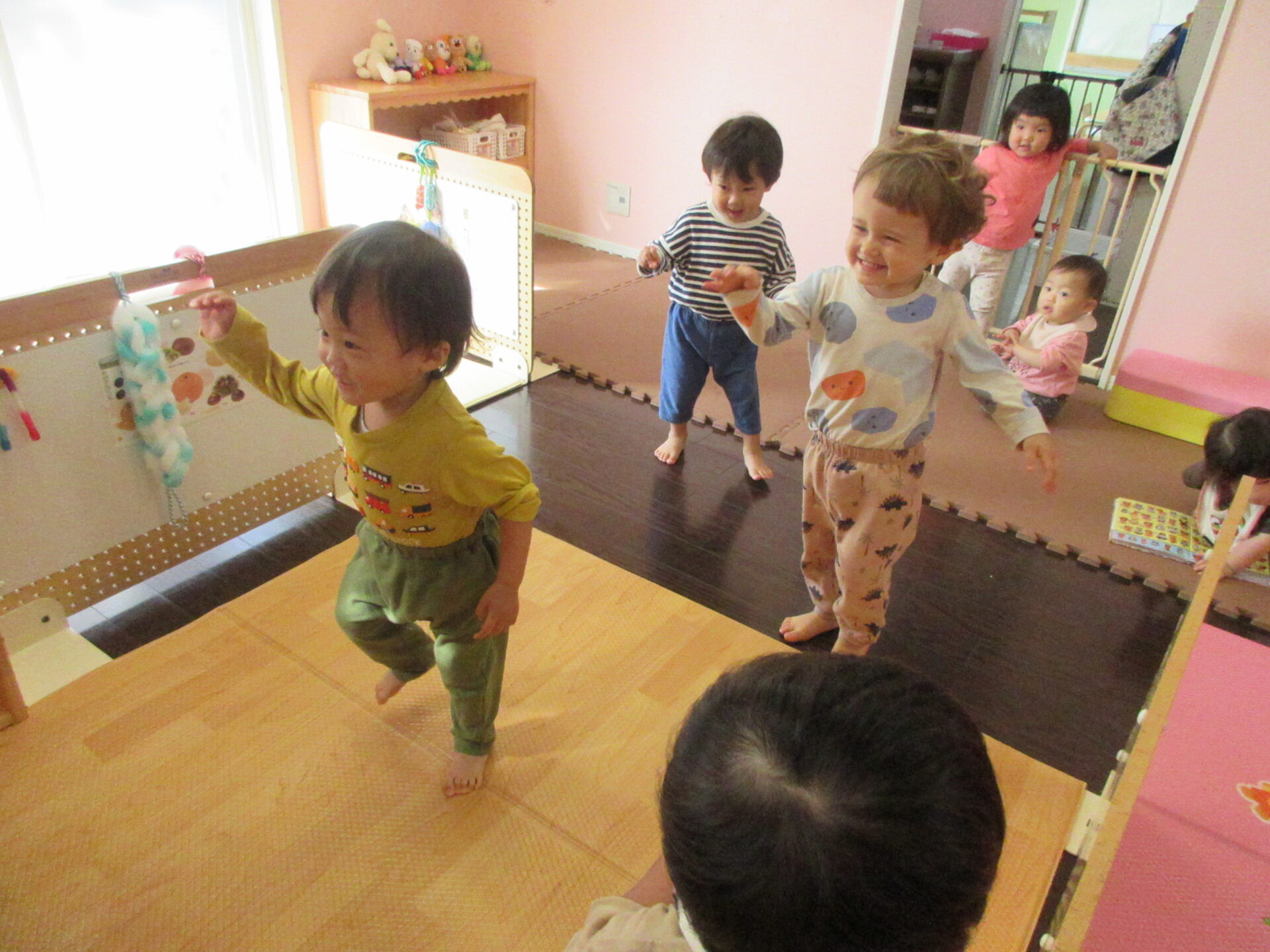 曲は、『グーチョキパーでパンプキン』です。当初、曲を流すと子どもたちは、「あんぱんまん!」「だんだんだん!」と普段から楽しんでいる別の曲を流してほしいとの要求がありましたが、保育者が全力で楽しんで踊る姿が伝わったのか、子どもたちもノリノリで楽しんで踊るようになりました❣❣今では、リクエスト曲ナンバー1です☝