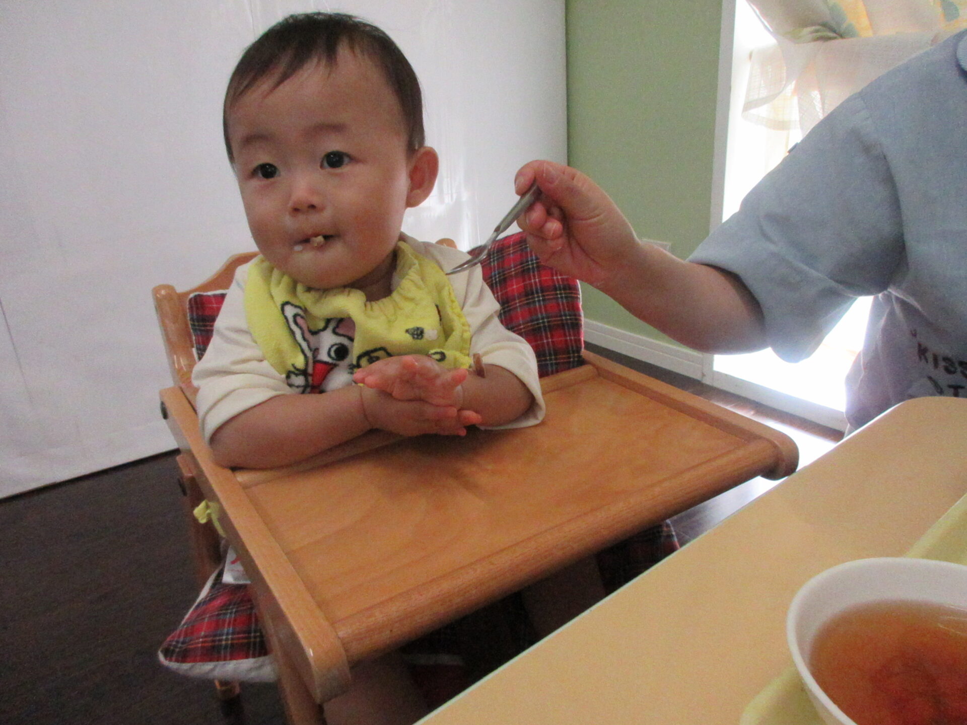 すいかグループ(0歳児)のお友だちは、食べる事が大好き!玄関に給食が運ばれてくるのを見ると、すぐに出入口に行き、大きな声で喜んでいます😄