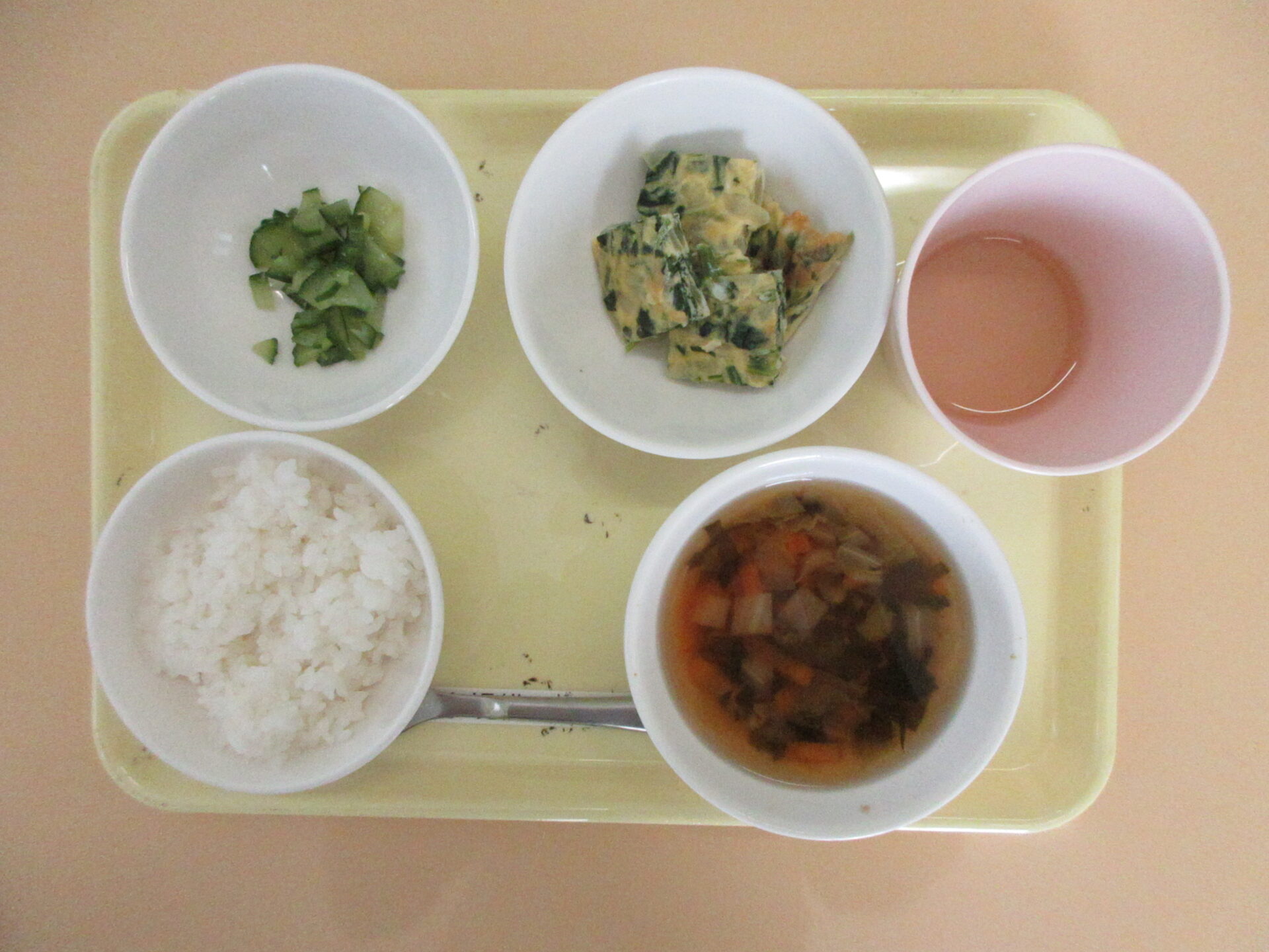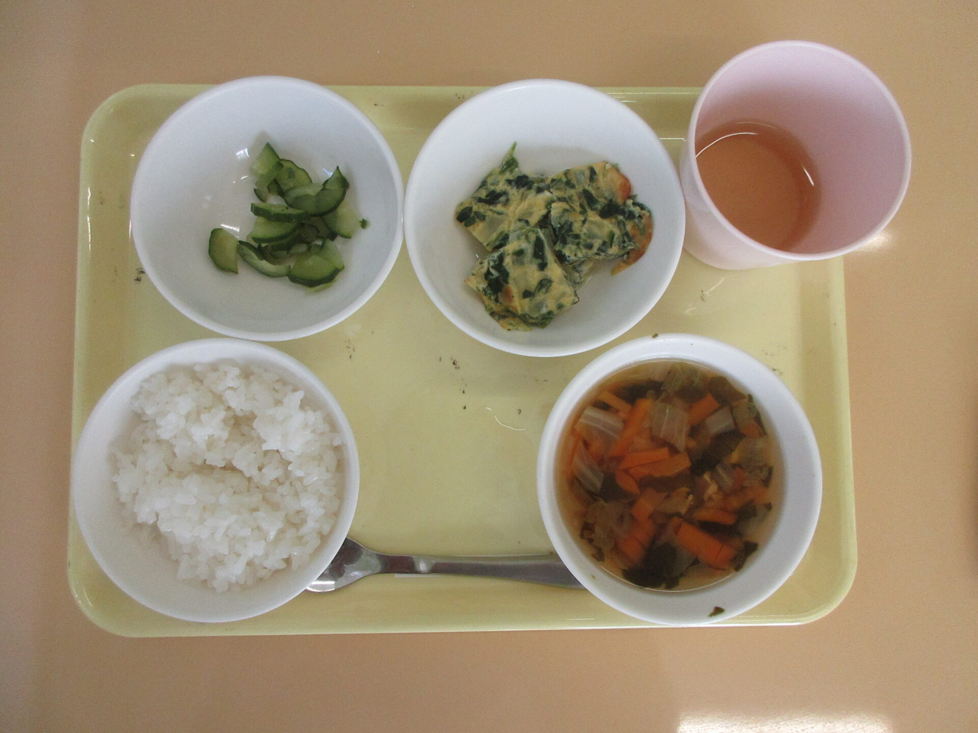 かた粥、白菜のスープ、ほうれん草のオムレツ、きゅり漬け