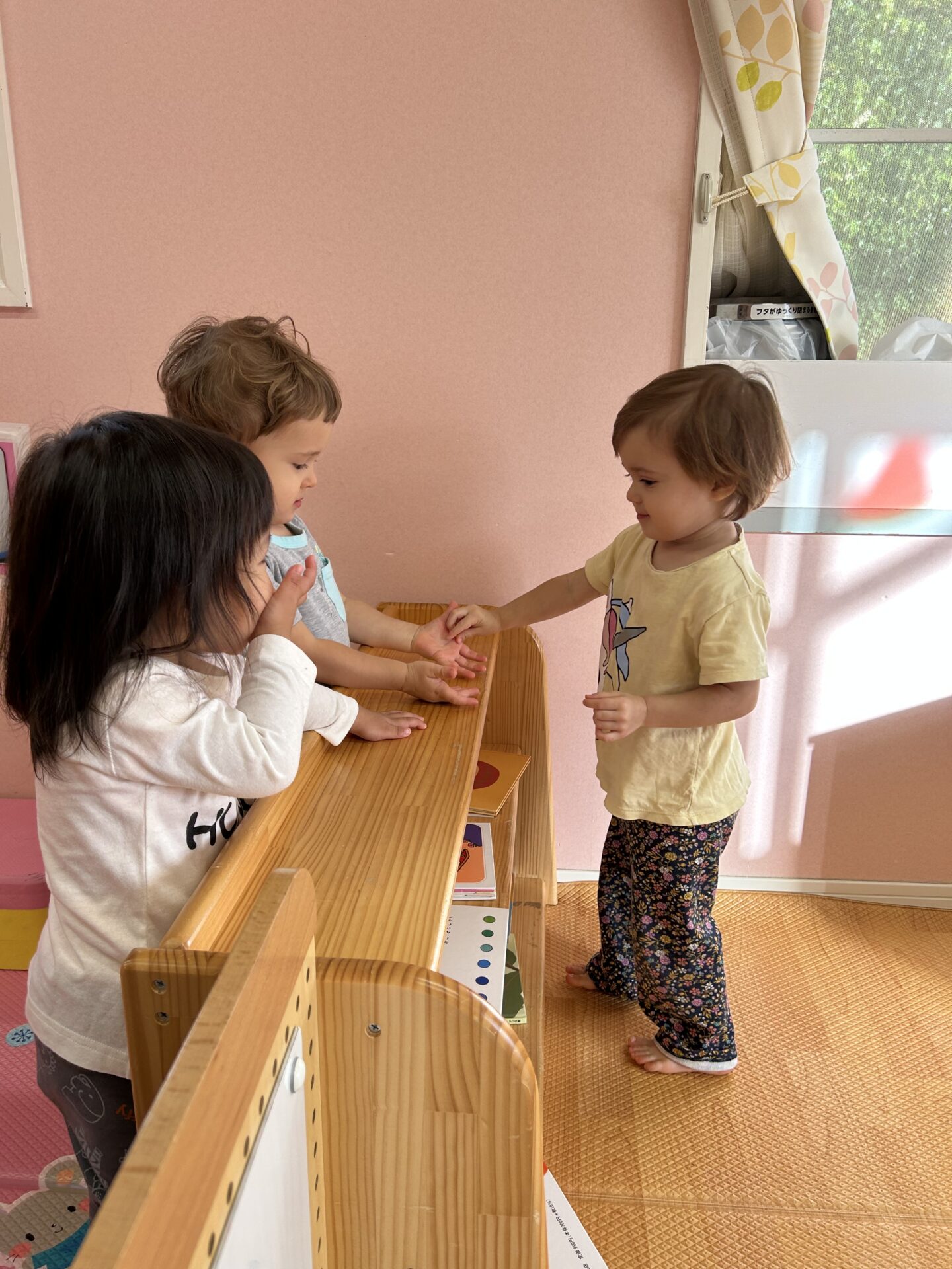 お友だちに「ちょーだい」とお願いされ、スイカを摘まむ真似をして、何度も渡していました。