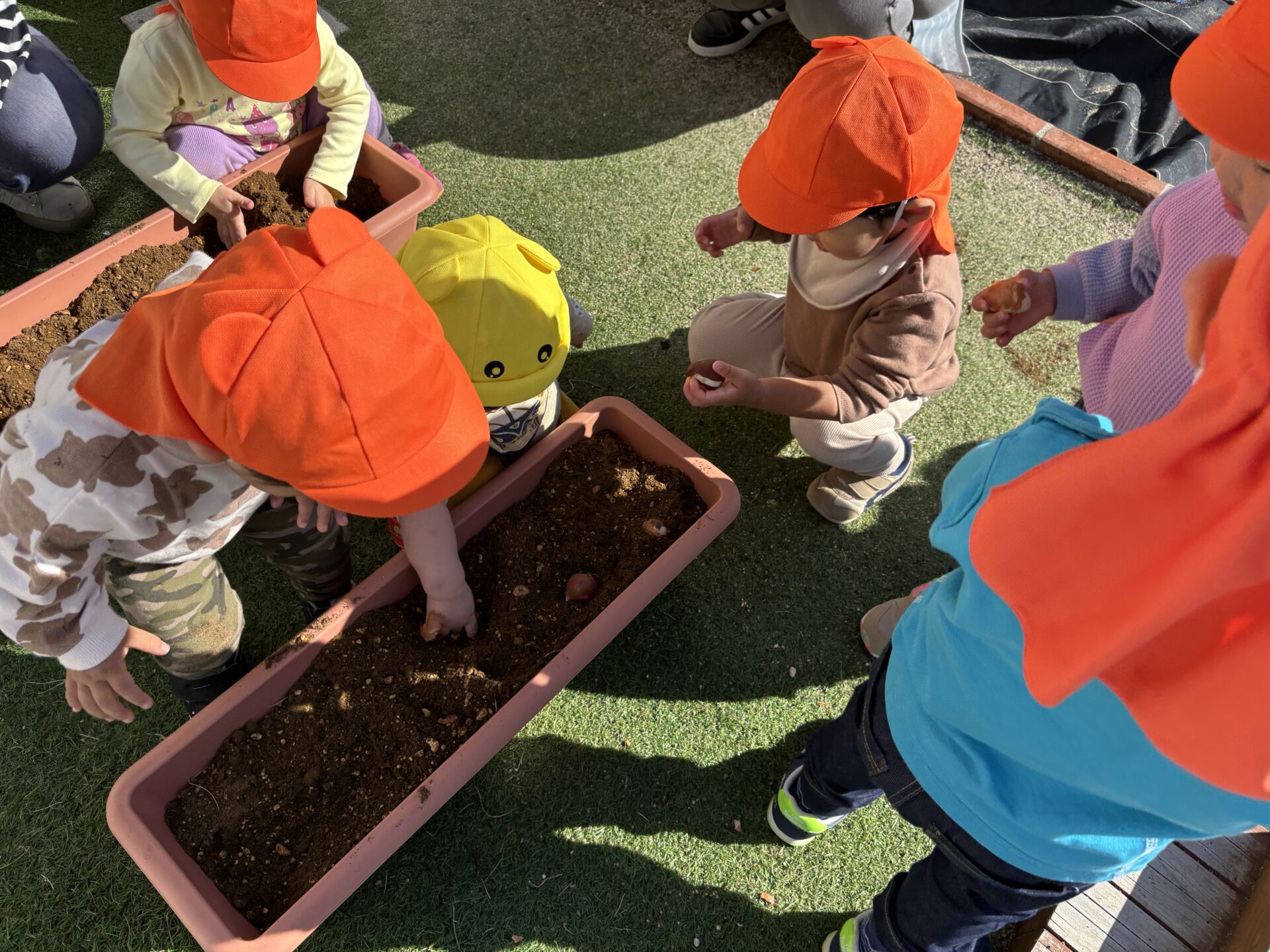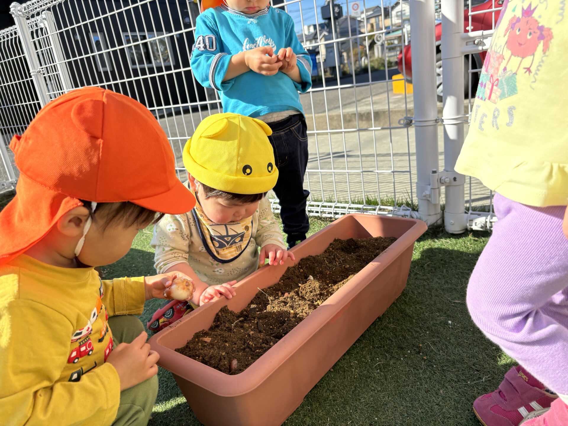 土の上に球根を置いて、「ねんねだよー」と、優しく土をかけるようにお話し、みんなで植えました。球根の皮をむくのにはまったお友だち、ずっと手に持っていたくて離さなかったお友だち、次々にはりきって植えてくれたお友だち、球根を触るのを怖がったお友だち・・・