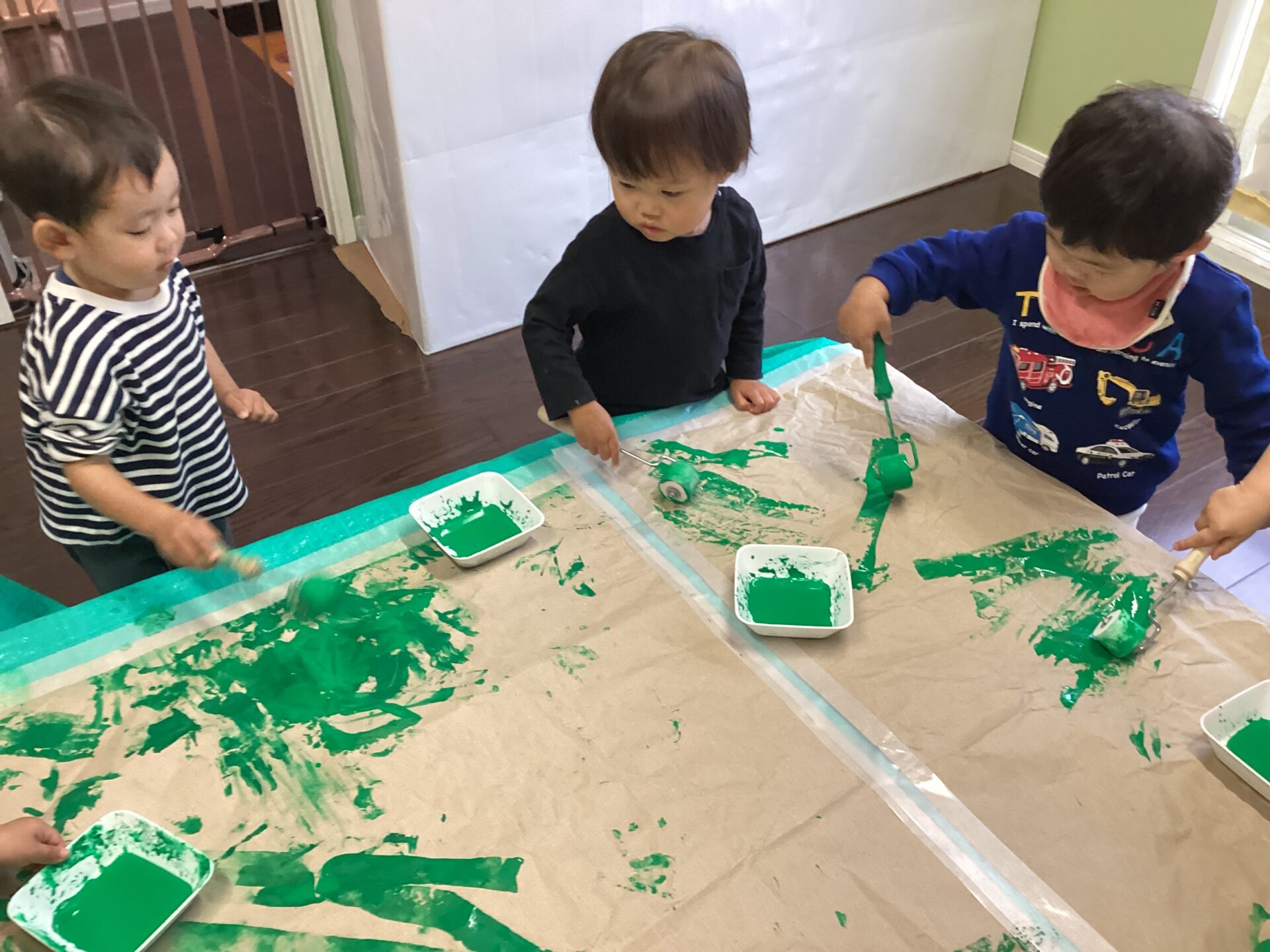 1歳児のお友だちも楽しくて、みんないつまでも塗っていました!!楽しい時の子どもたちの集中力は、本当にすごいなと感じます。みんな絵の具あそびが大好きです。