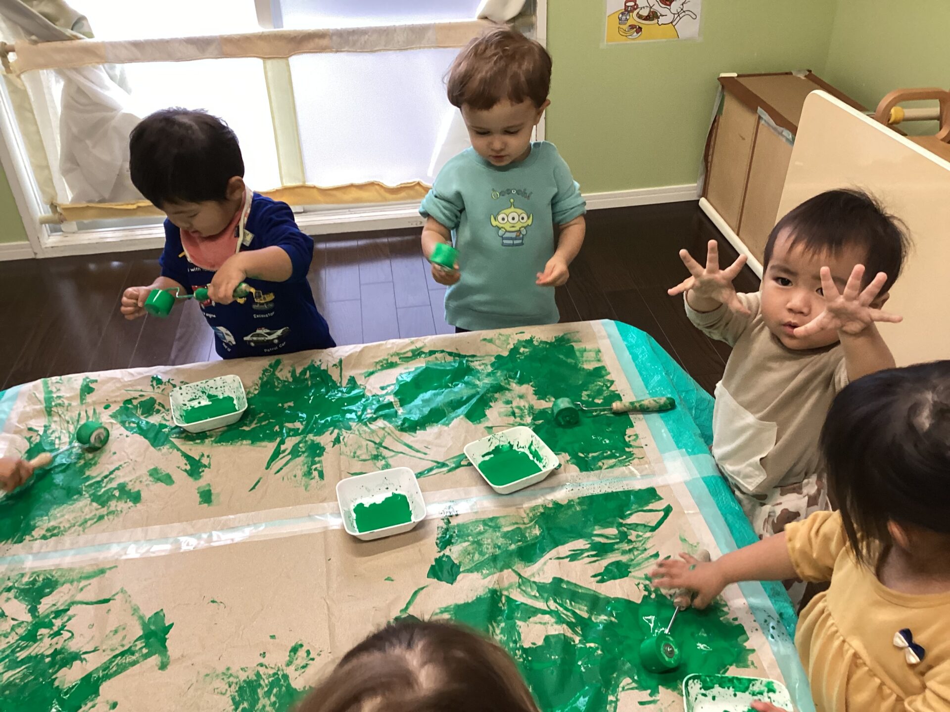 1歳児のお友だちと、0歳児のお友だちが、力を合わせて塗ってくれた大きな緑色の紙。