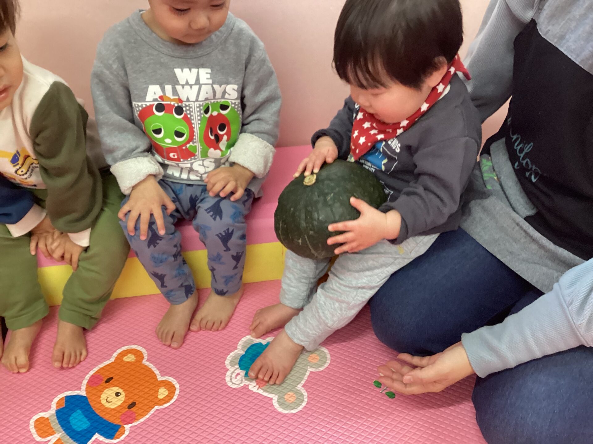 まずは、観察です。大きな1個のかぼちゃを見ることは、初めてのお友だちもいたのではないでしょうか。順番に持って見ると、「おもいー!」と言いながら、とても嬉しそう。