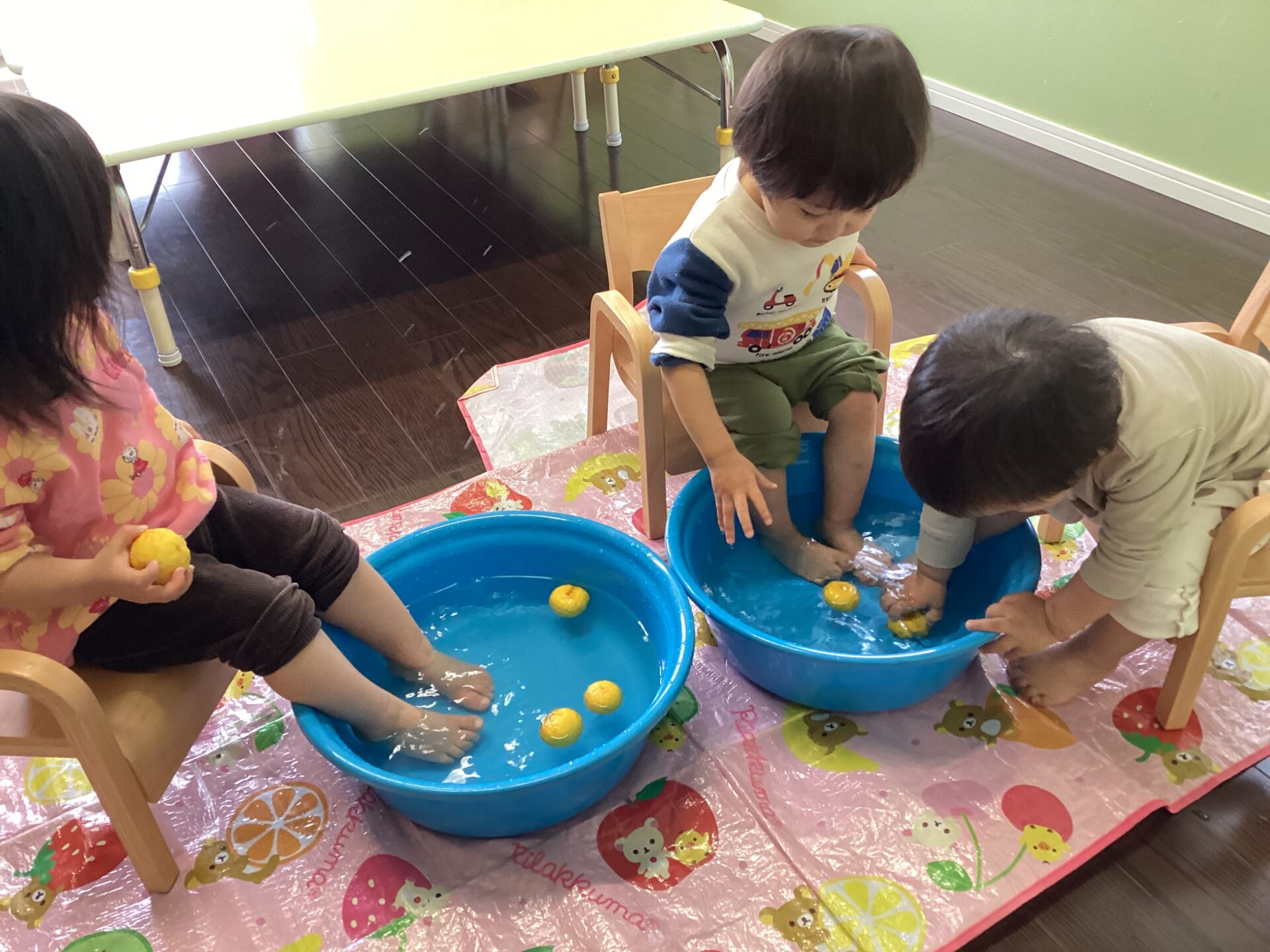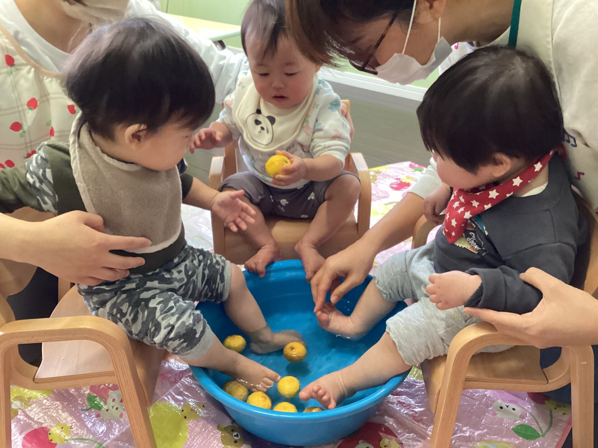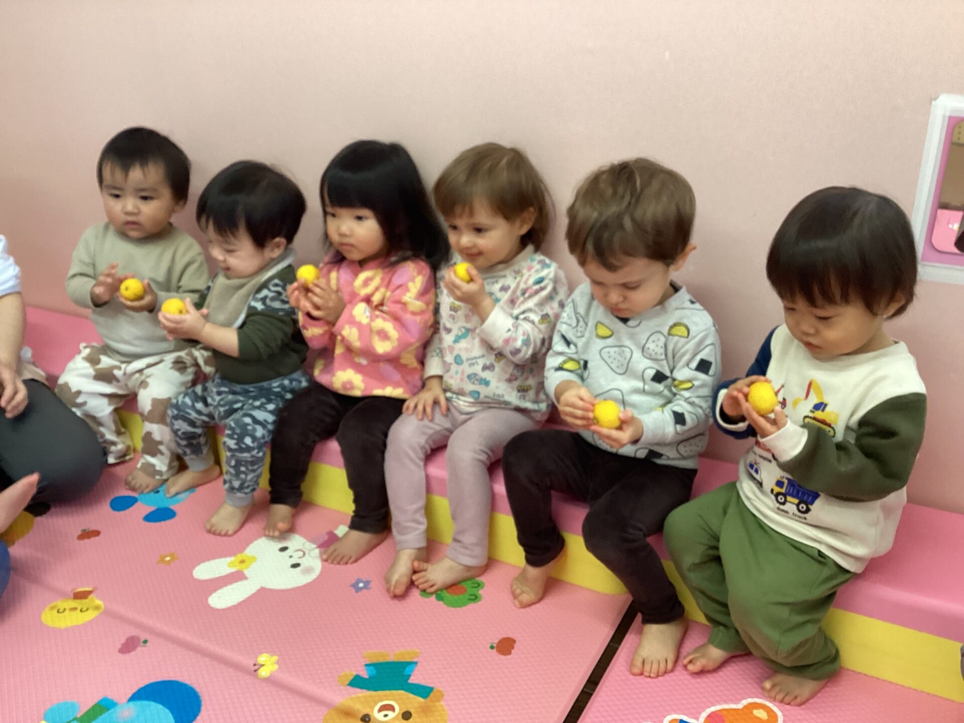 「これなんだ?」と、保育者が聞いてみると、「みかん!」との答え。最後には、覚えてくれたお友だちも、かわいく「じゅじゅ(ゆず)!」と、答えてくれていました。