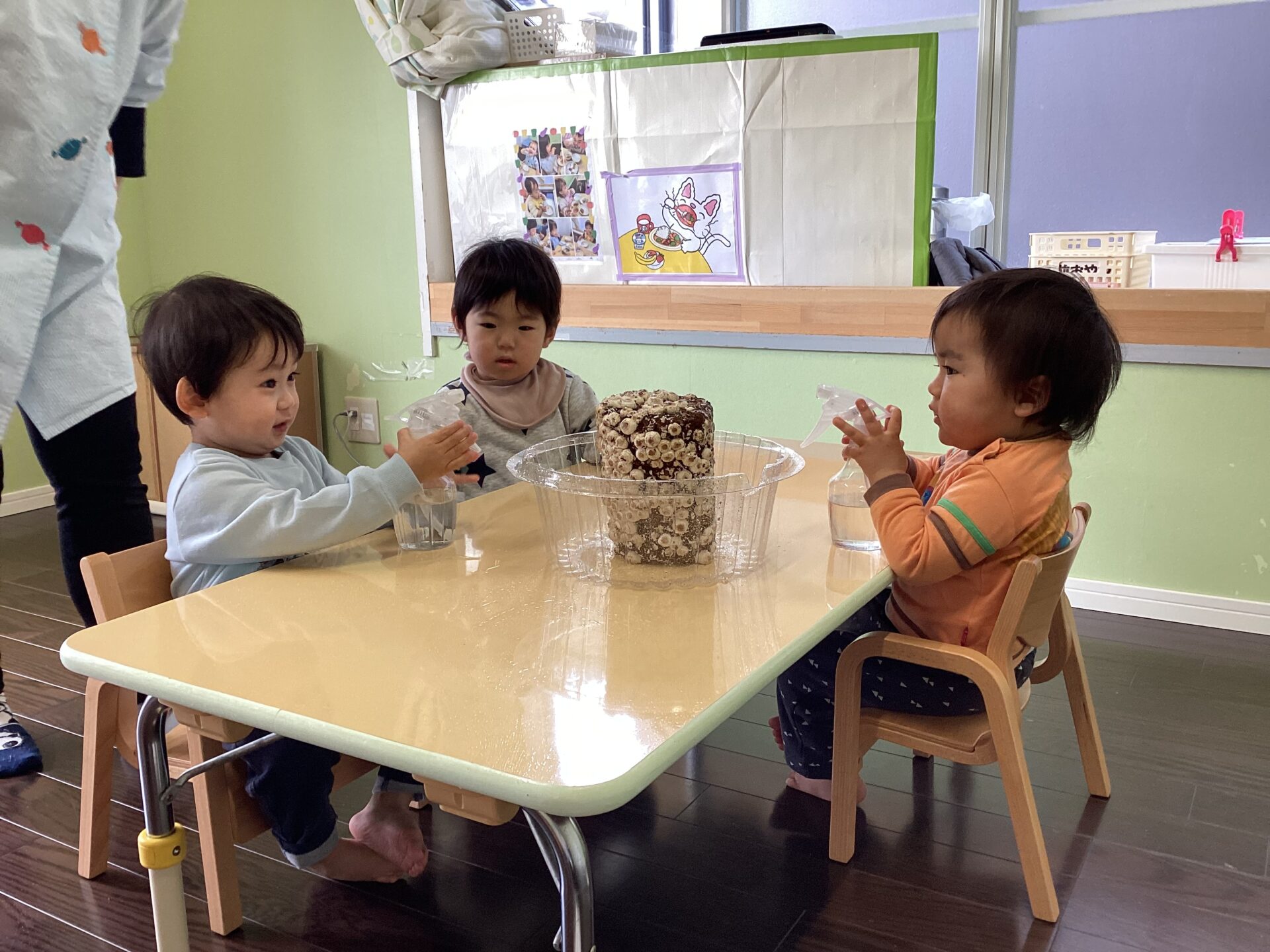 霧吹きがとても上手に使えるようになり、1歳児のお友だちは毎日お世話(霧吹き)が楽しいようです。「シュッ シュッしてくれる人?」と、保育者が声をかけると、はりきって来てくれます。