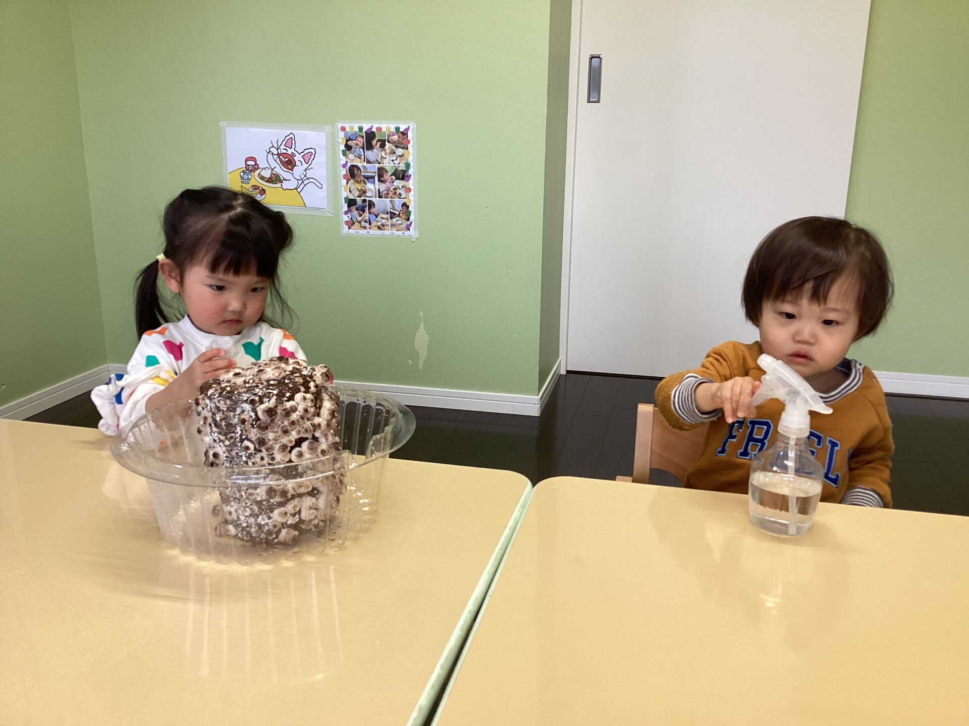 しいたけを食べて欲しいな!好きになって欲しいな!しいたけと仲良くなるには・・・と、先生たちで考え、出した答えが〝しいたけを、みんなで育てよう‼〟でした😄