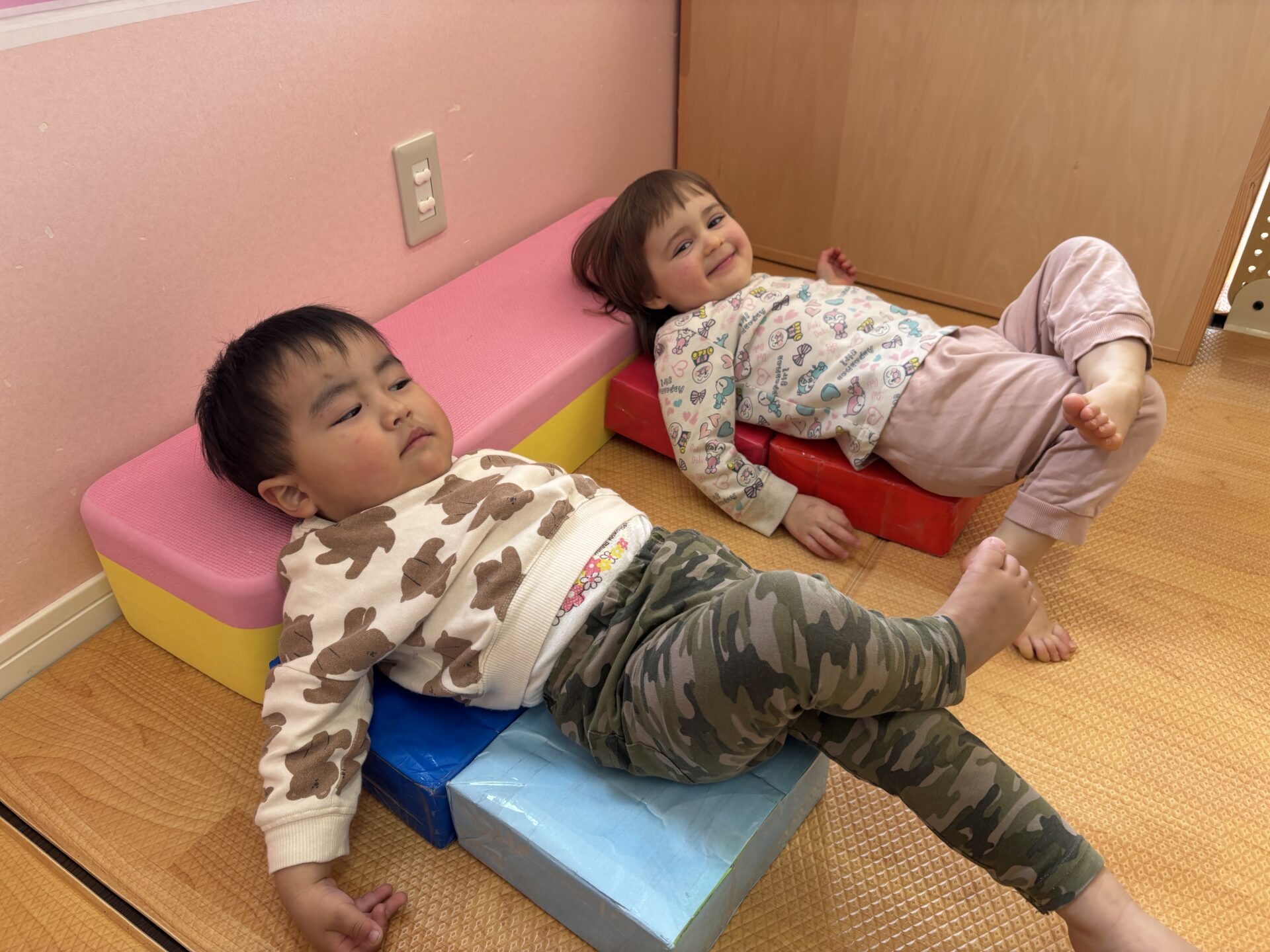牛乳パックで作った積み木を並べて、横になるお友だちです😁