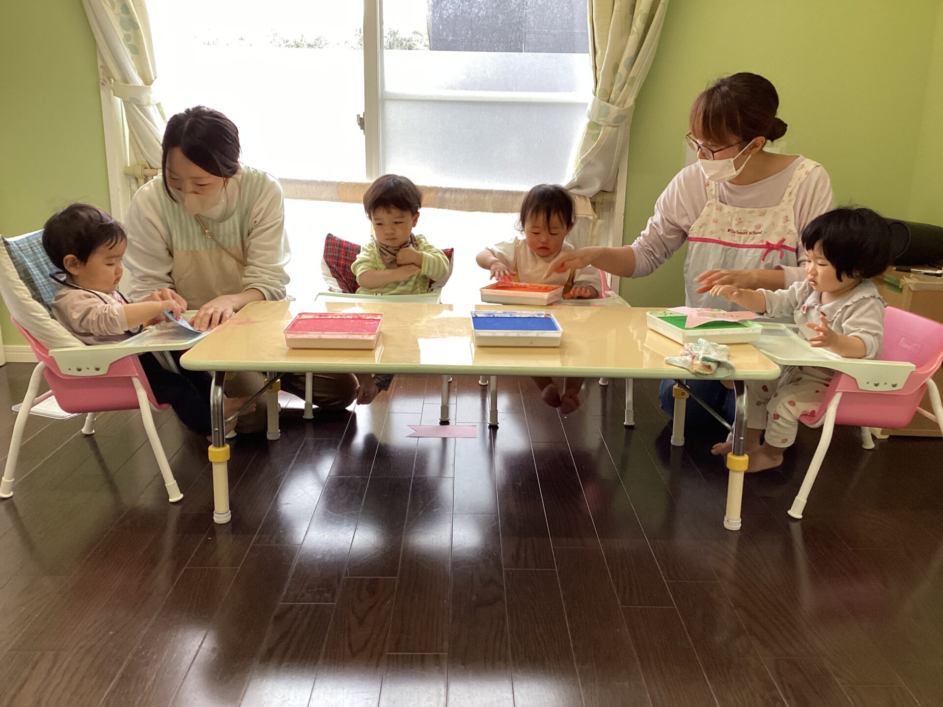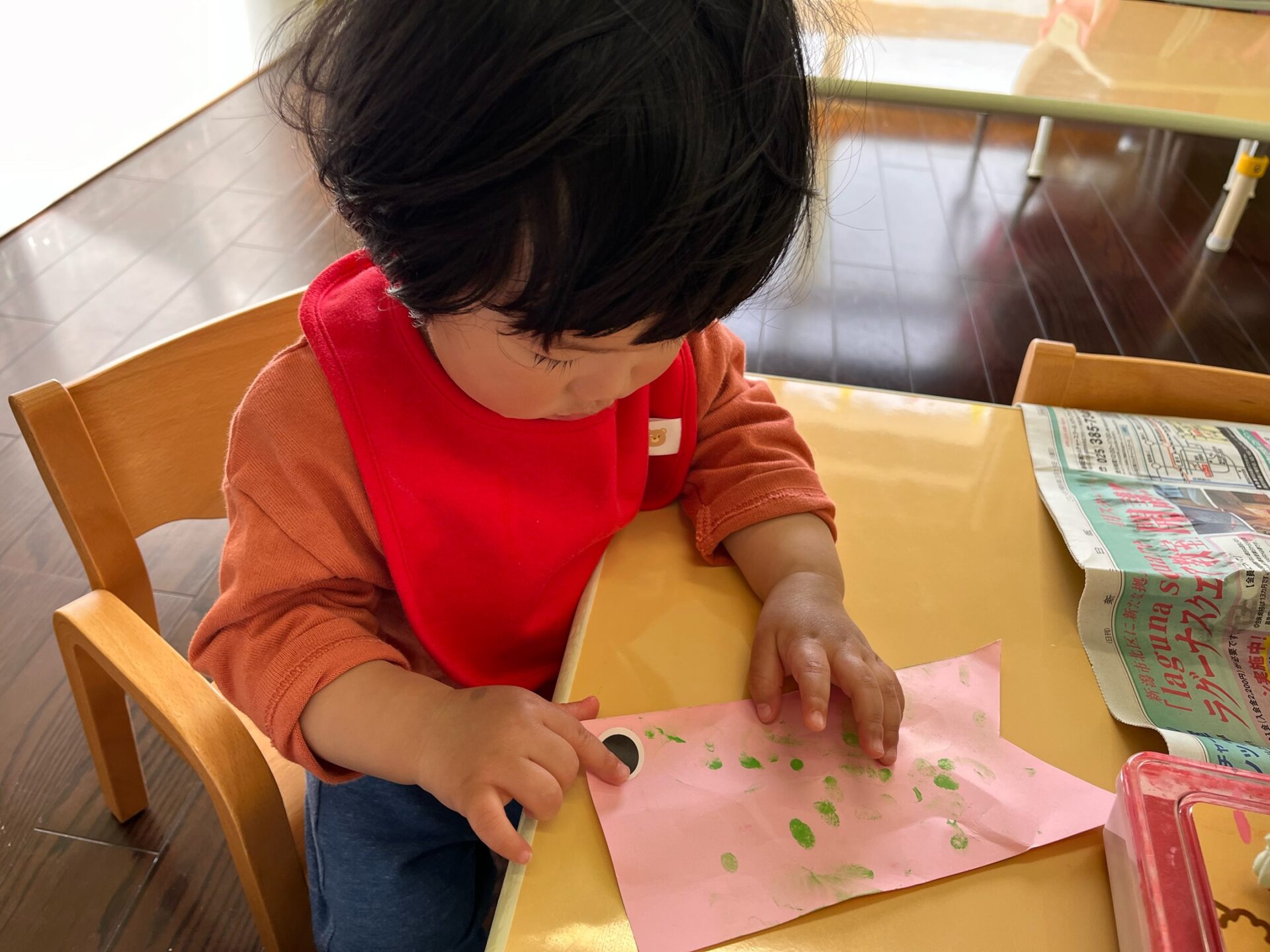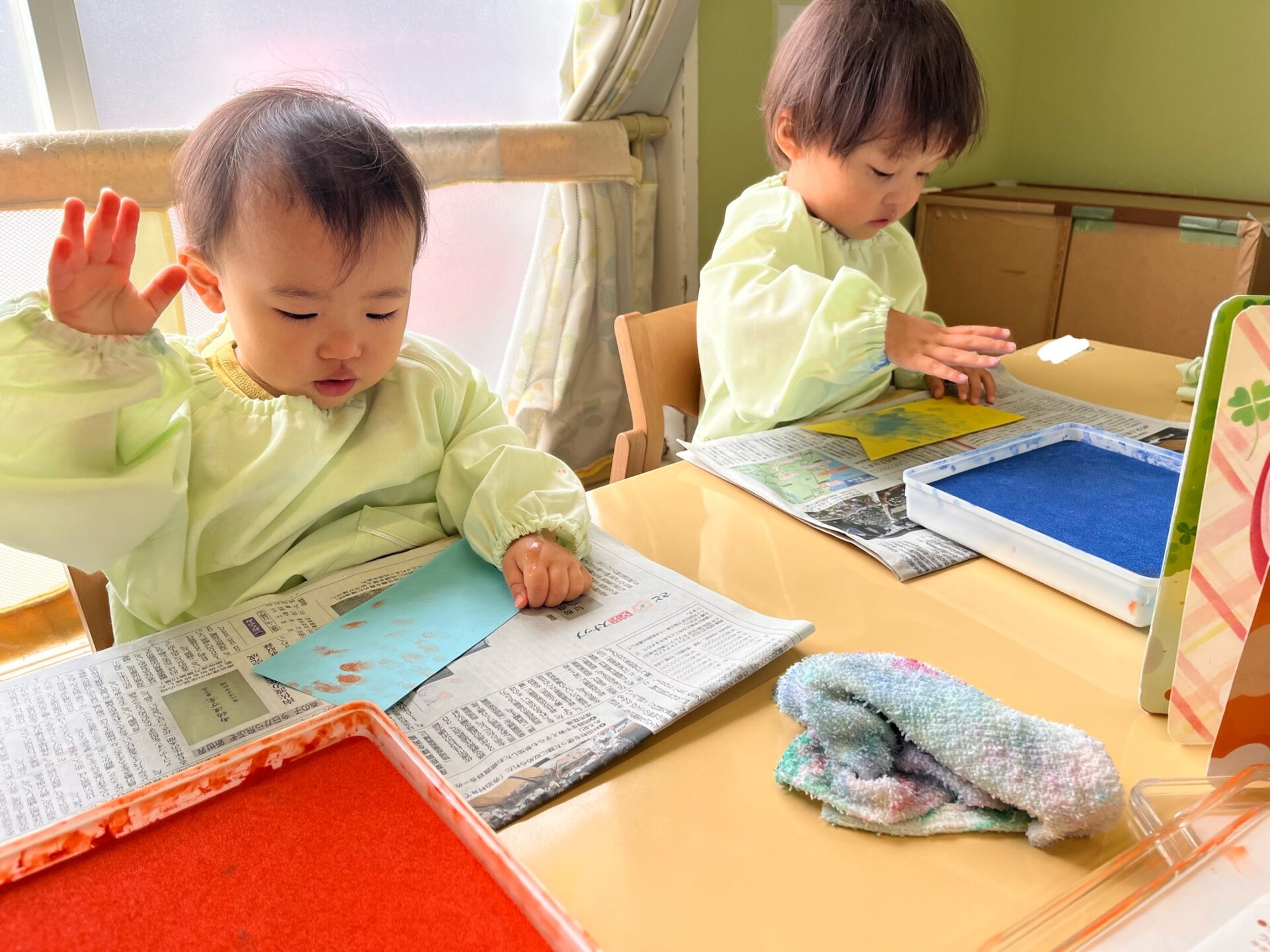 小さな指に絵の具をつけて、思い思いにスタンプを楽しみました。
