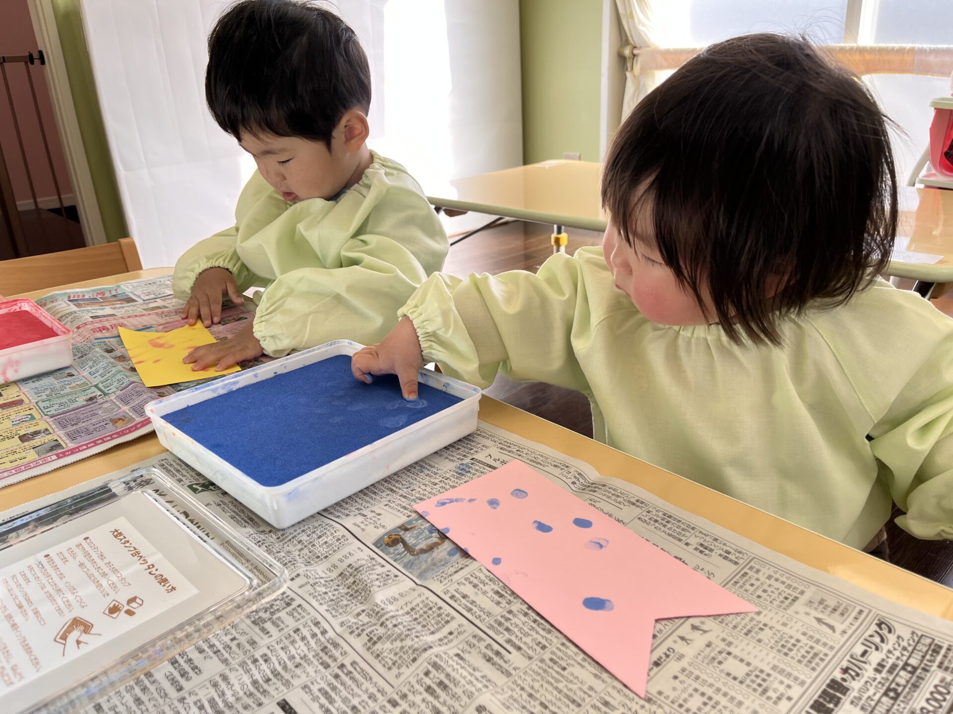指スタンプやシール貼りを通して、指先の感覚を養ったり、様々な素材や色に興味を持ち、子どもたち一人ひとりが自由に製作あそびを楽しめるようにしていきたいと思います。