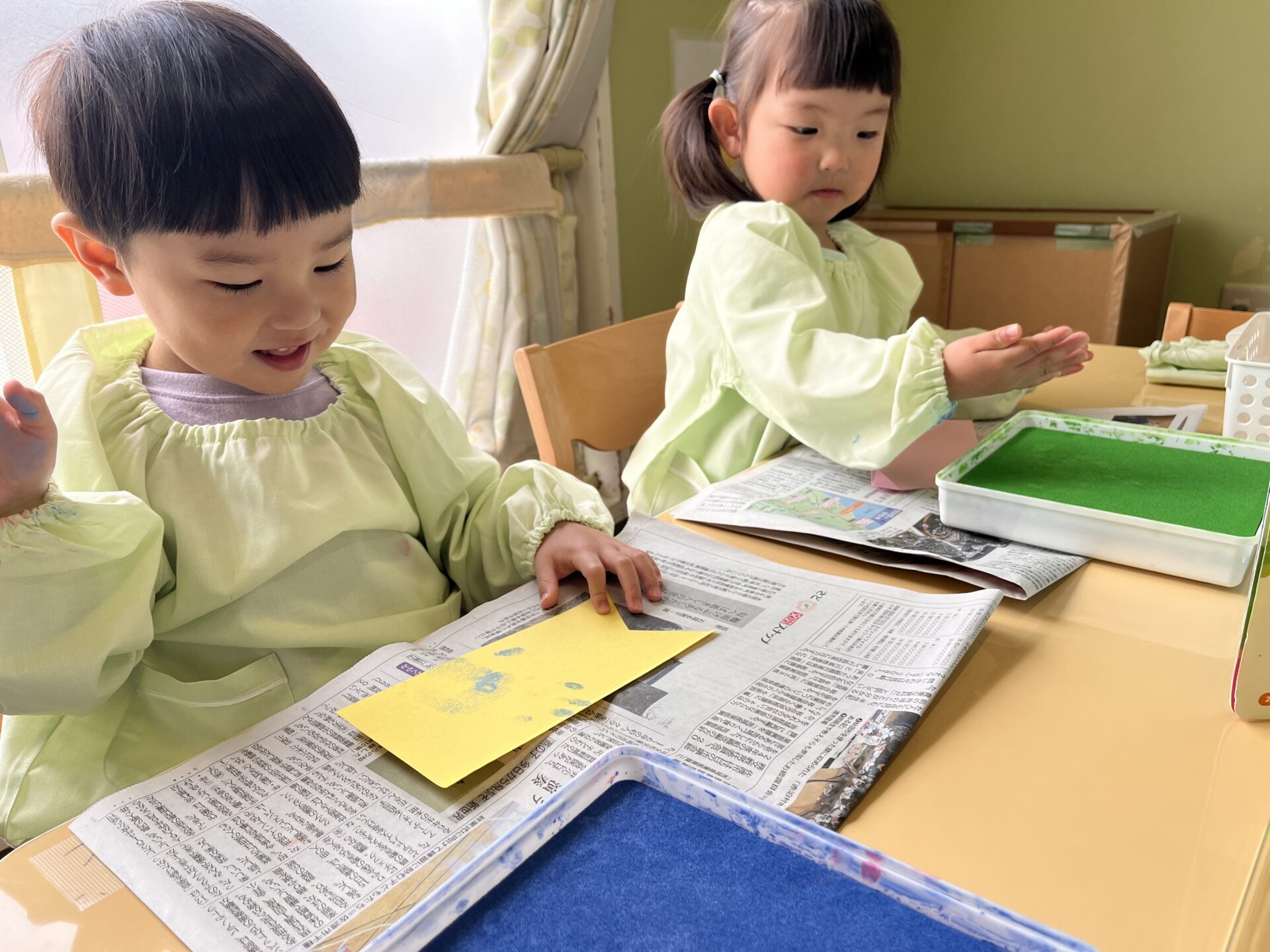 絵の具が染み込んでいるスポンジの感触に喜ぶお友だちや、不思議そうに見つめるお友だちなど、色々な反応が見られました。
