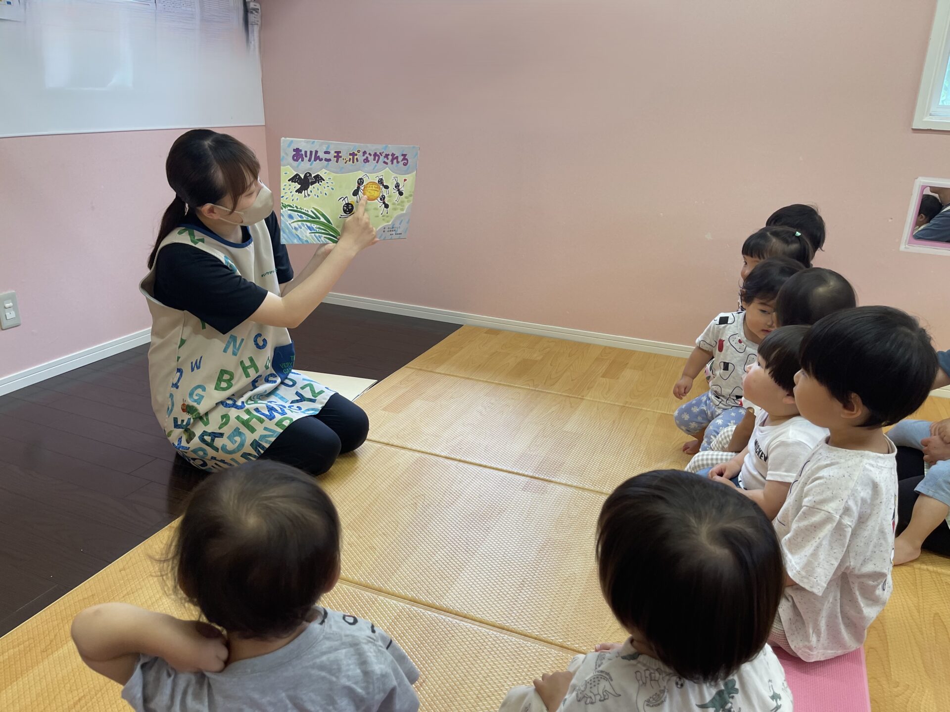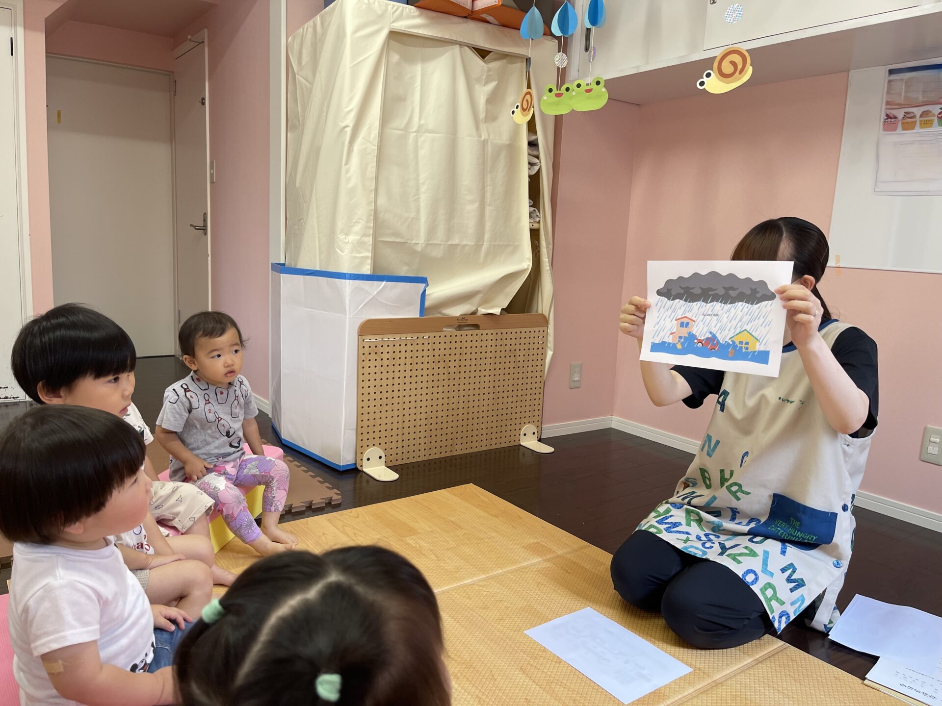 訓練では、「ありんこチッポ ながされる」(作・わしお としこ/絵・山本 祐司/制作・教育画劇)という紙芝居を見て、水害の時のお約束を確認したり、もしも川が溢れ、保育園が水びたしになったら、、、とイラストや写真も交えて行いました。