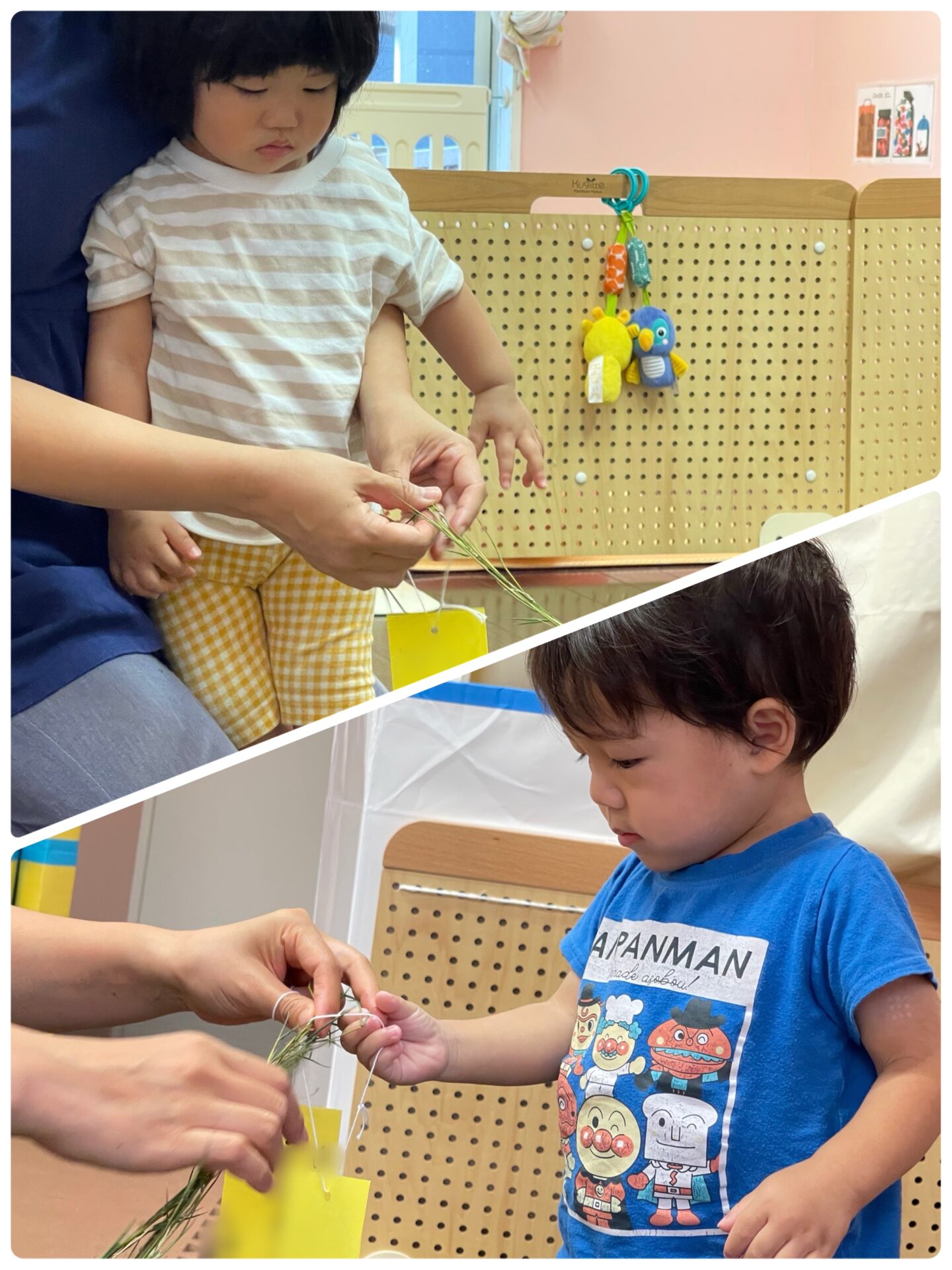 玄関ホールに笹を置くと、お部屋からもよく見えて、「きれいだね」「私の あるね」とお話ししながら給食を食べていました😊