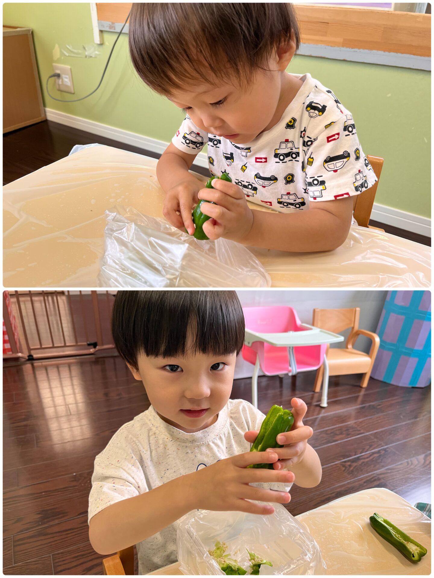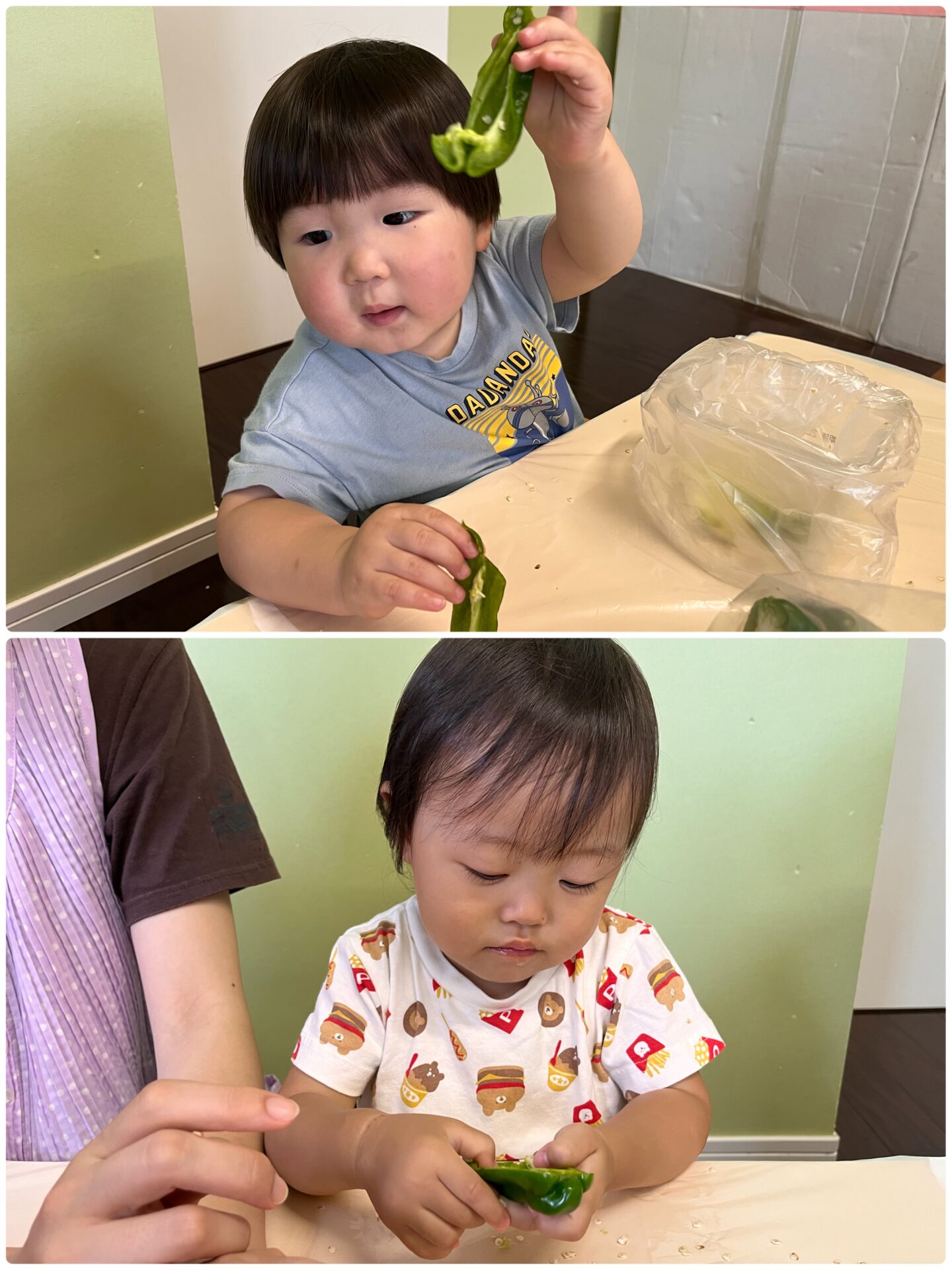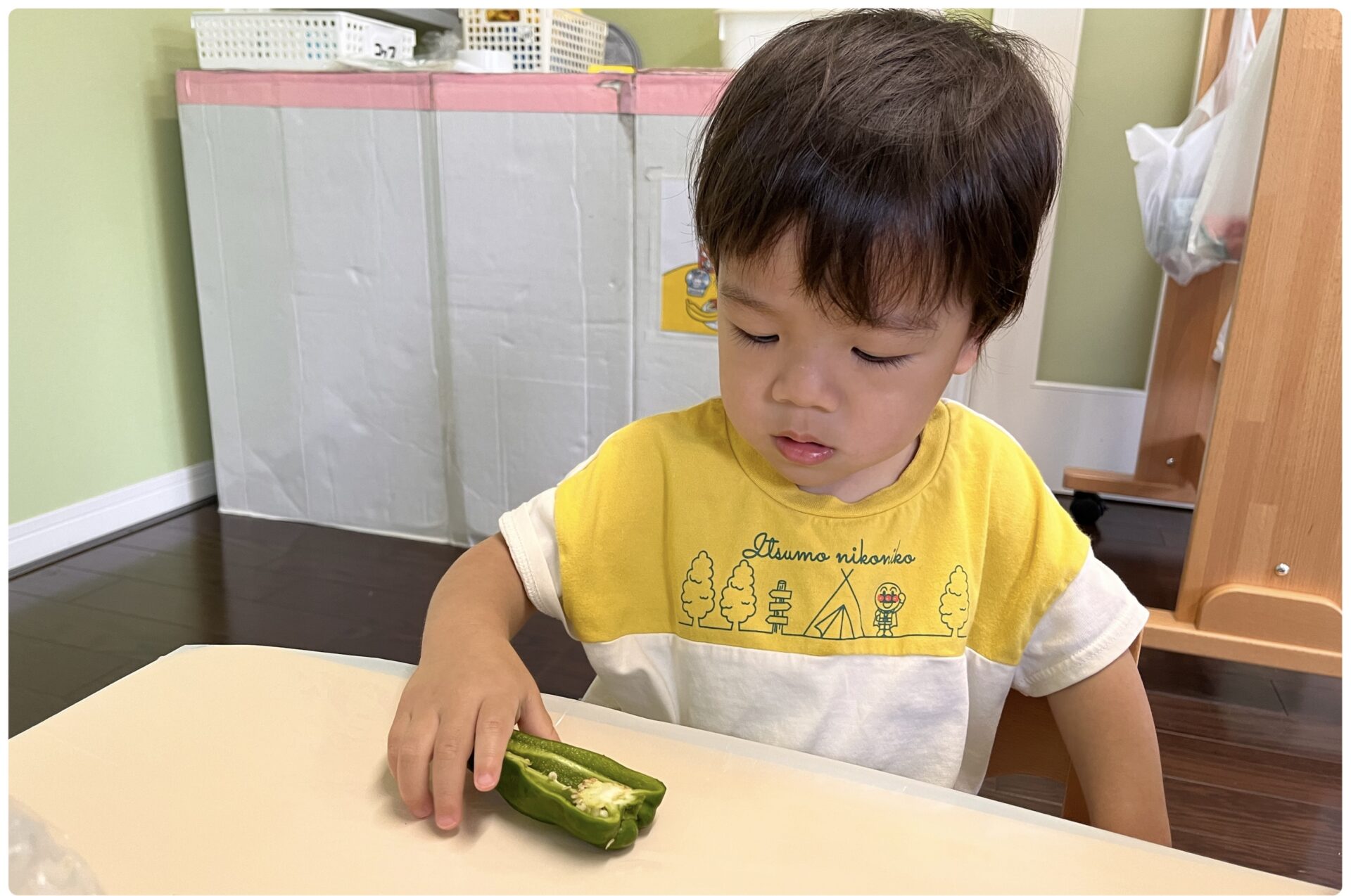 朝からピーマンの匂いでいっぱいの保育室に、「なんのにおい〜?」と不思議そうに話していた子どもたちです。
