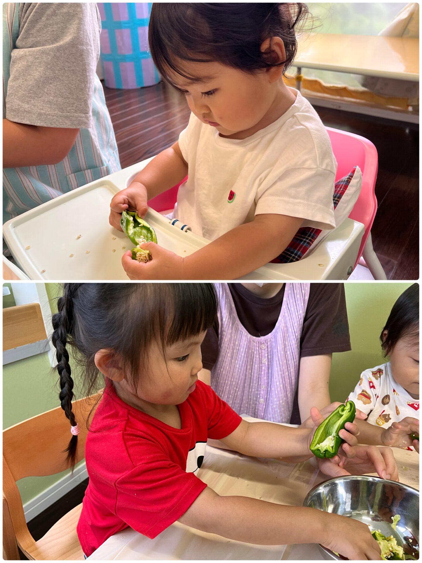 種を一つひとつ丁寧に取るお友だちや、豪快にピーマンをパキッと割るお友だちなど、楽しみ方も様々。