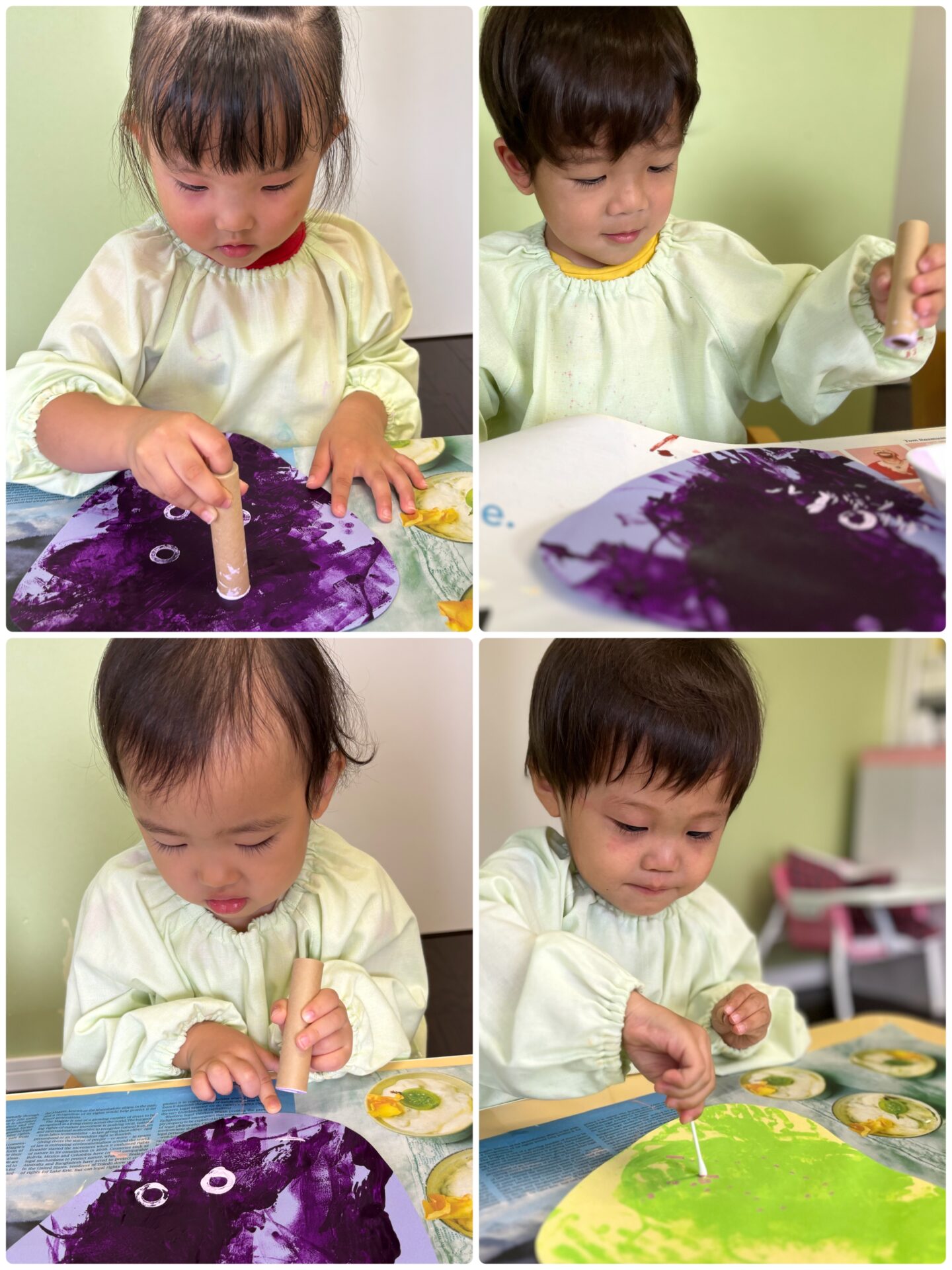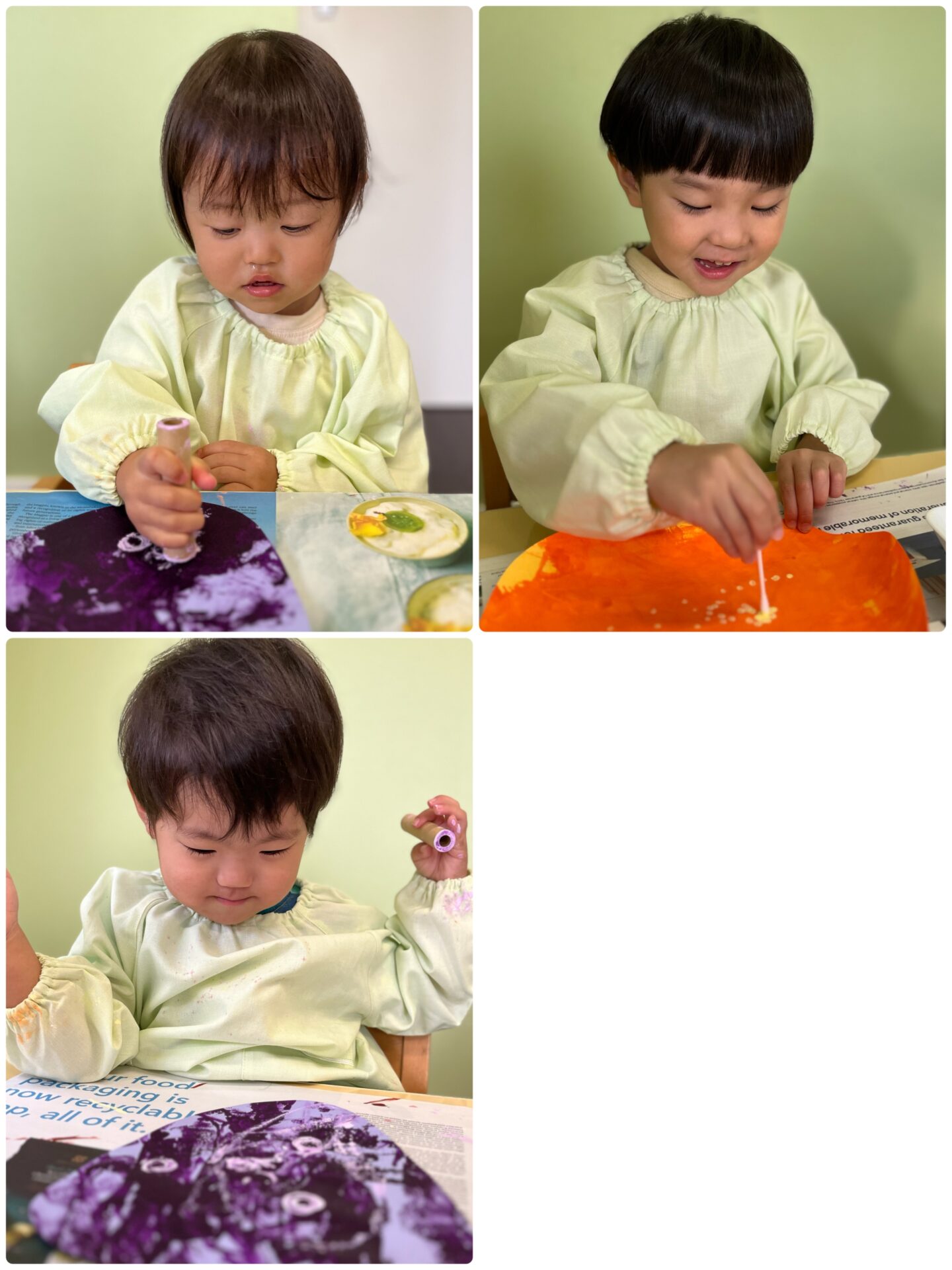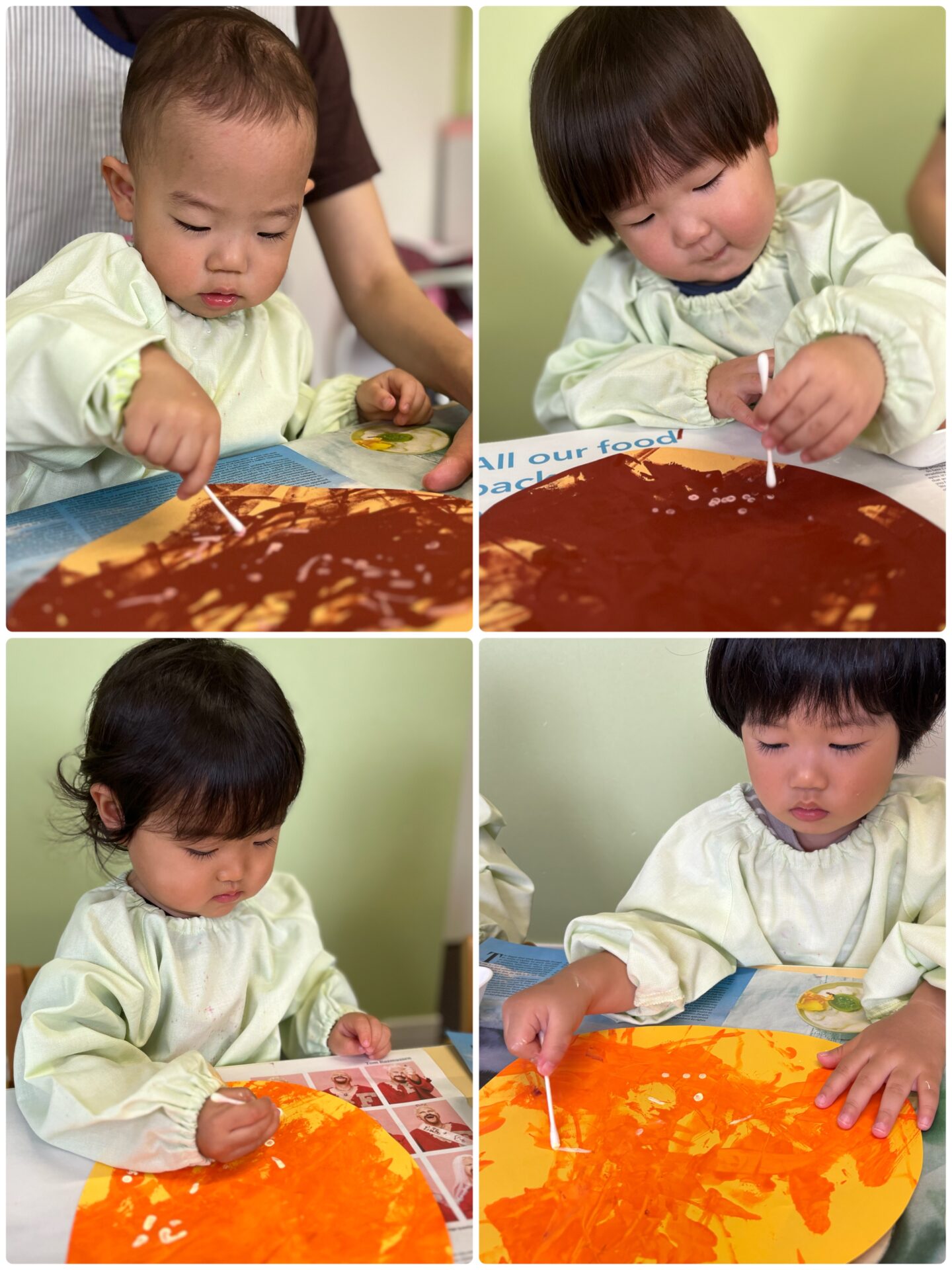 小さな綿棒や廃材をつまむのは、少し難しいお友だちもいましたが、「てんてんてん♫」と声に出しながら模様を付けていました😊