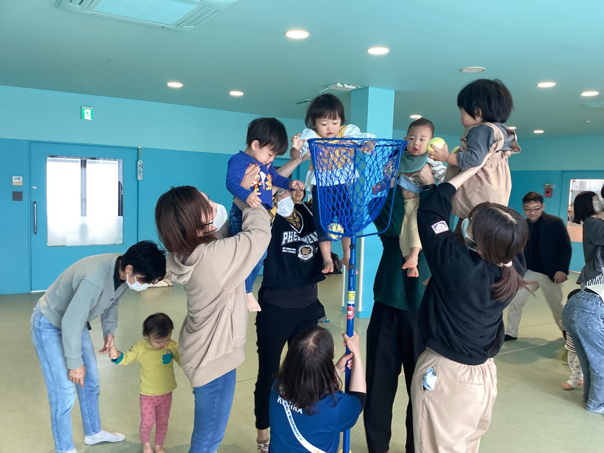 お家の方に抱っこしてもらい、玉をポーン!親子で力を合わせて頑張りました👏