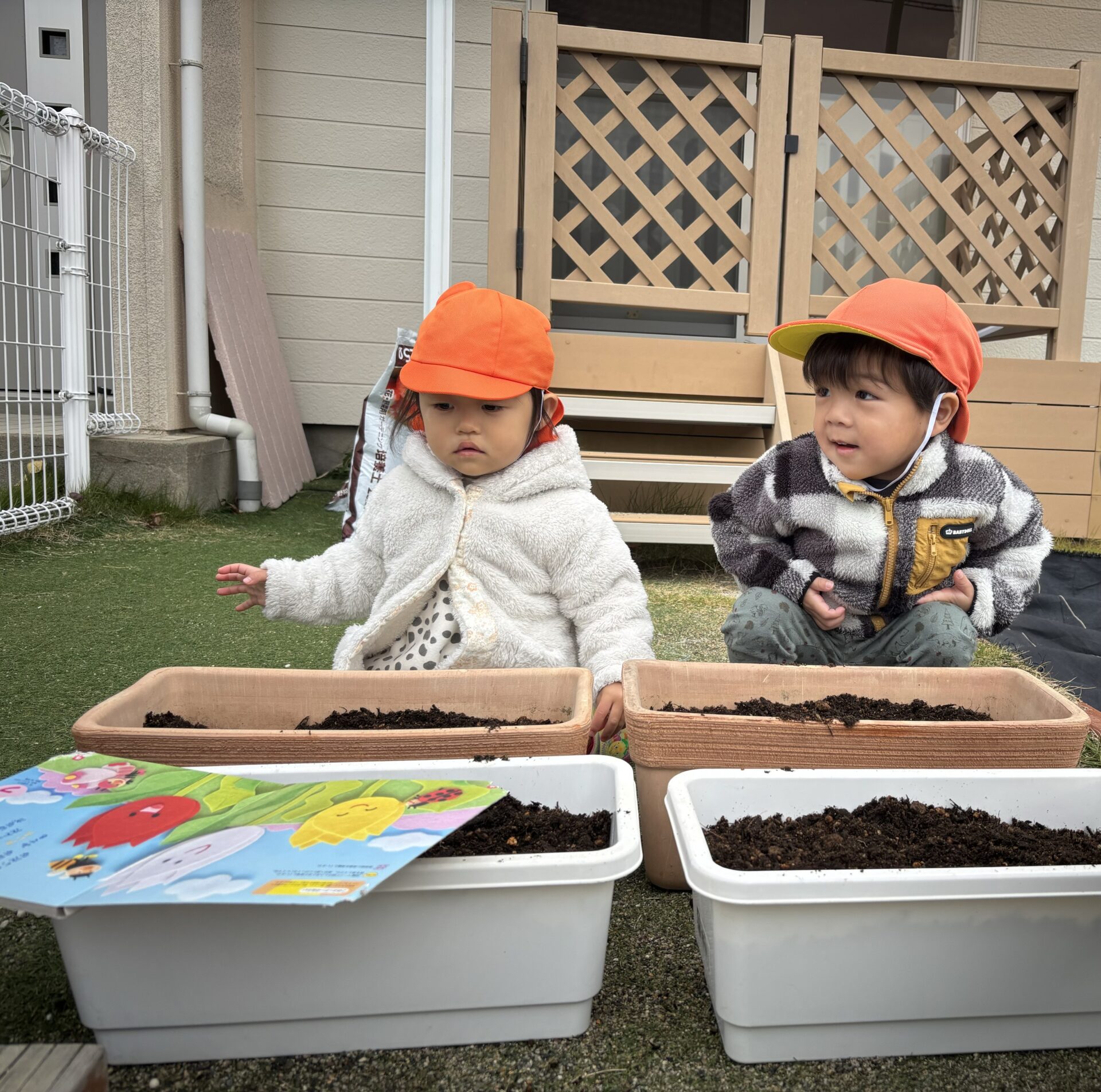 チューリップのお歌を聞いたりお話を見たりしながら、順番にプランターに植えました✨