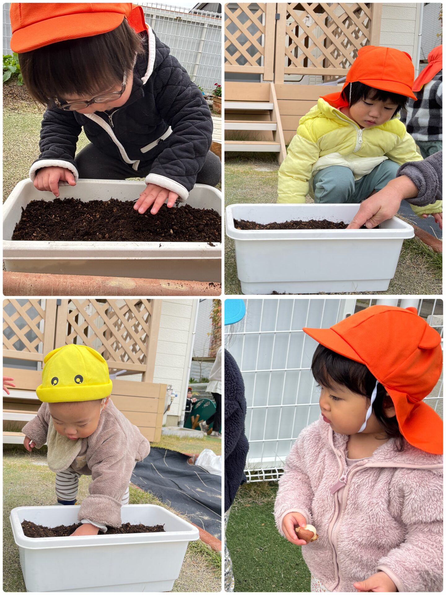 園庭に出て保育者が球根を見せると、「これはなんだろう?」とみんな不思議そうなお顔👀「これがチューリップのお花になるのかな??」といった表情で、手にしていたお友だちが多かったです。