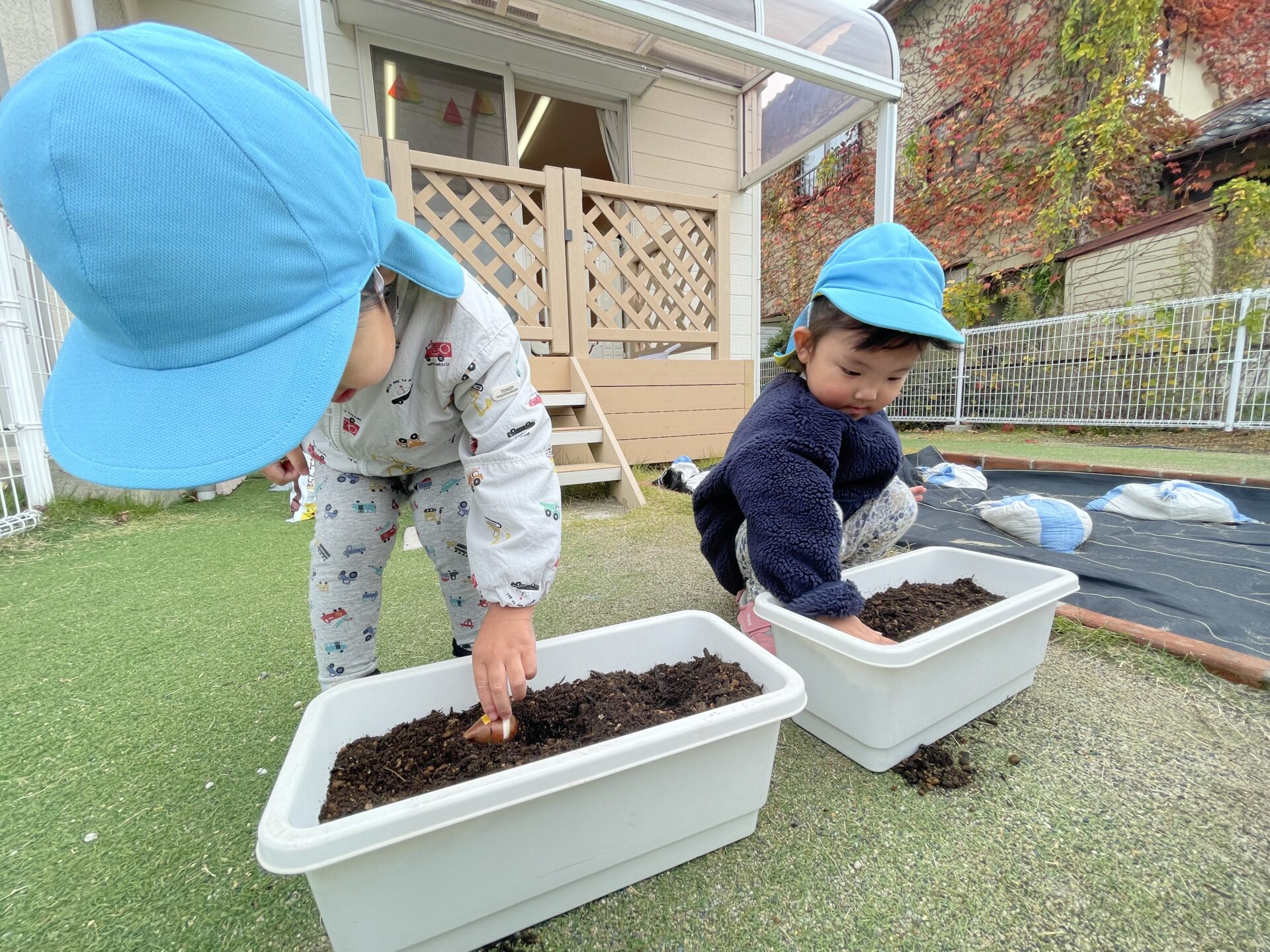 「土のお布団の中に球根を入れて、優しく土をかけてトントンしてね」とお話すると、とても大切そうに土をかけてくれていました😊「もっとやるー!」と、はりきっていたお友だちも。