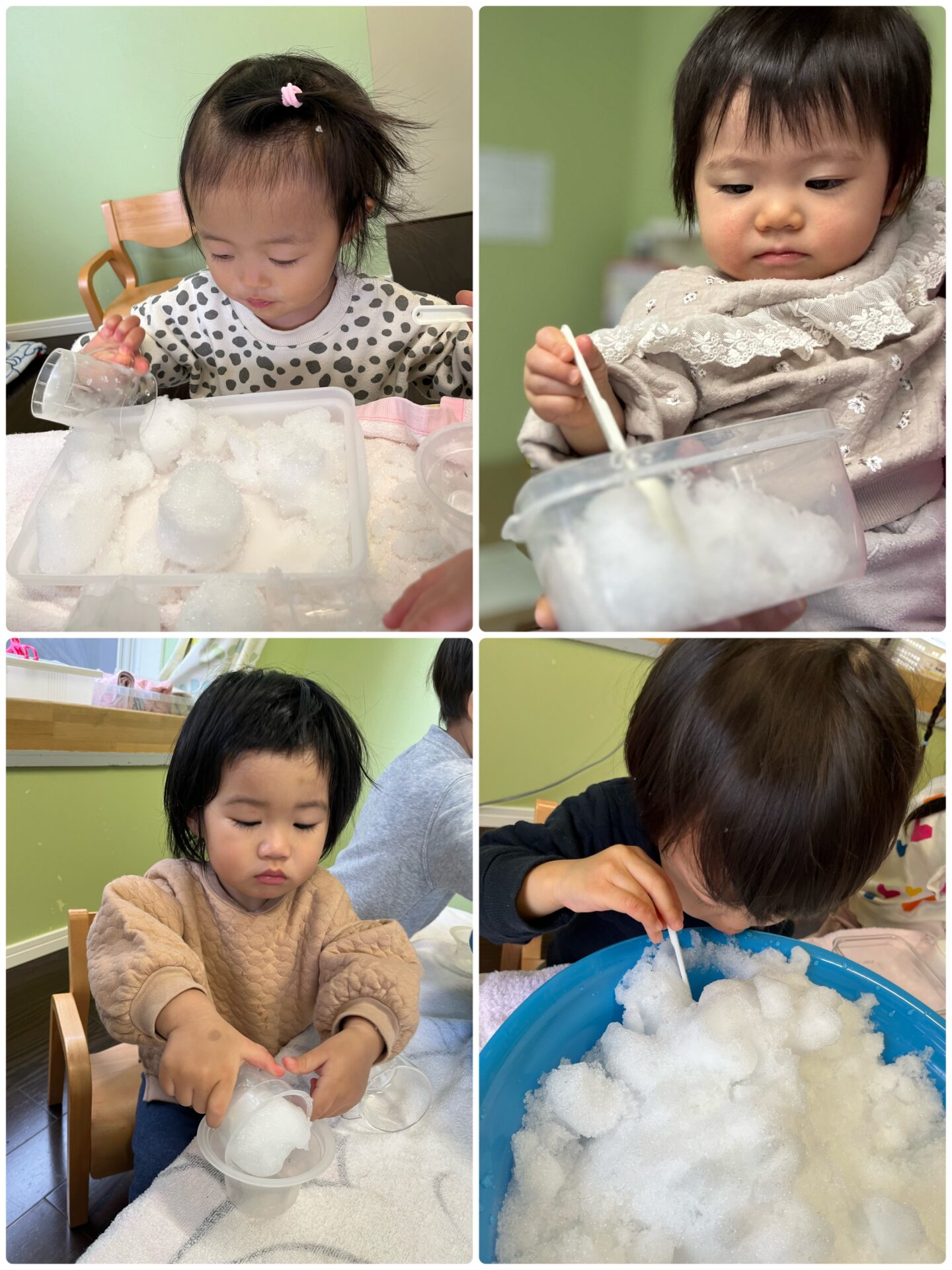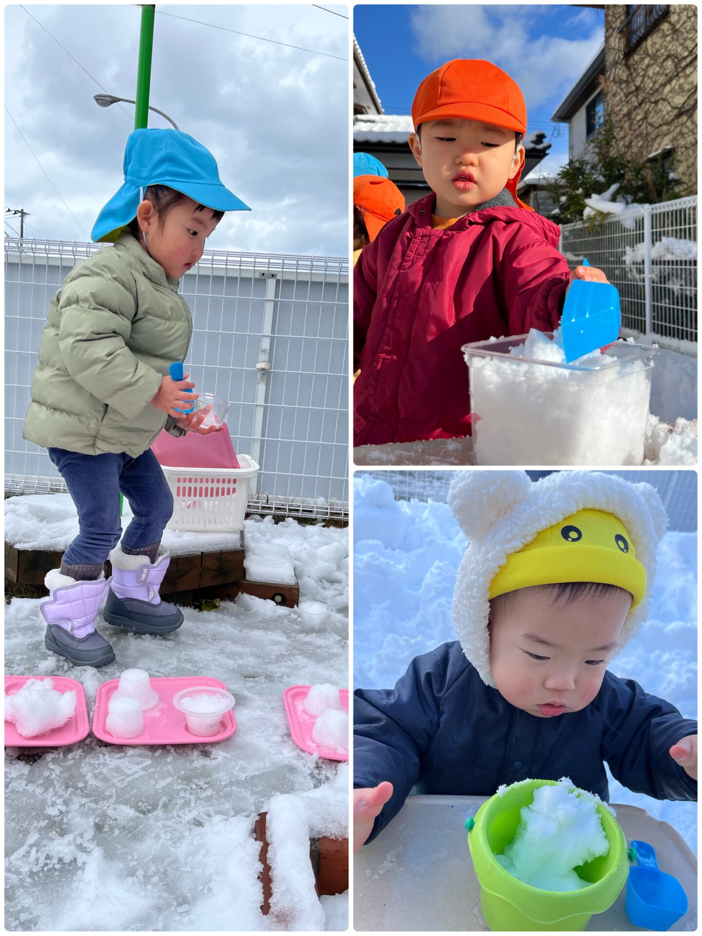 初めは慎重にスプーンでつついていた子どもたちですが、だんだんとダイナミックになり、ざくざくと雪を混ぜていました。雪お団子を作って並べたり、穴を開けて雪の中には何があるのか覗いてみたり。カップに雪を詰めてひっくり返せば、雪プリンの出来上がりです🍮