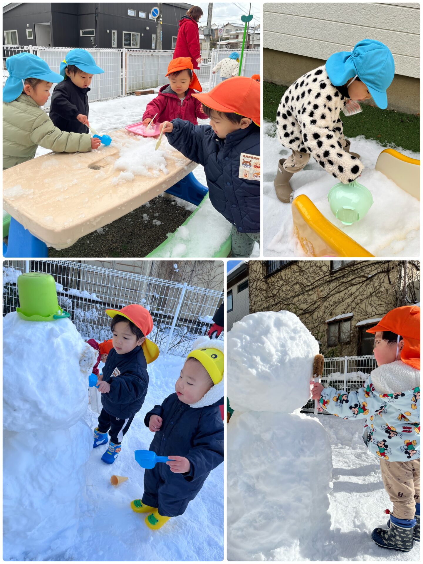 保育者が子どもの背と同じくらいの雪だるまを作ると、みんな大喜び🎶「何か、目になるものはないかな?」「鼻も付けるといいかも!」と相談しながら完成させました。