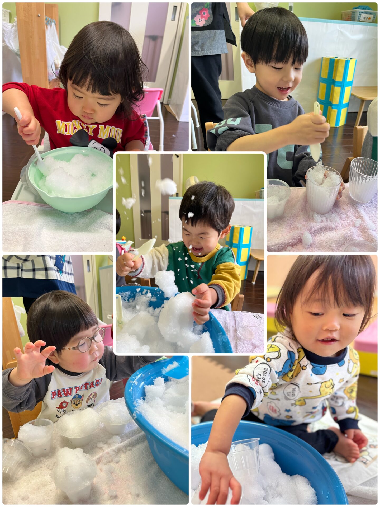 雪が降り続いているときは外に出られないので、たらいに雪を入れて、お部屋の中で雪にふれて遊びました。