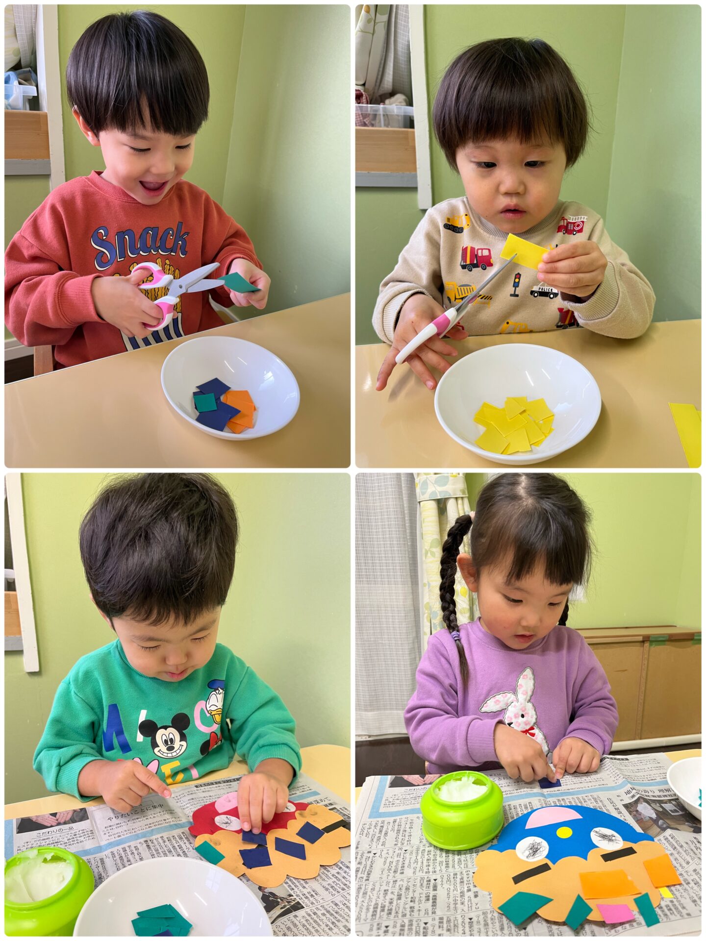 ハサミに慣れているお友だちも、保育者と一緒に切ったお友だちも、頑張りました!ハサミで切った紙は、鬼の髪の毛になります。のりの使い方もみんな上手になり、1枚ずつ丁寧に貼っていました!
