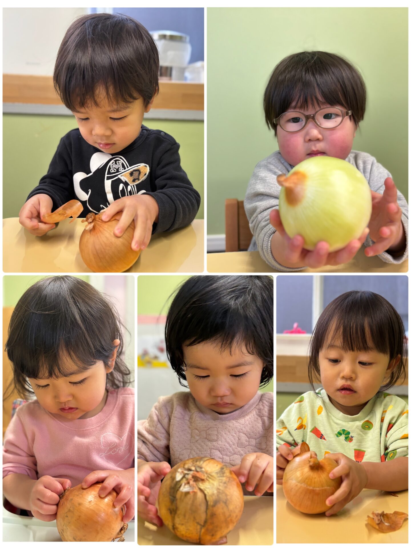 大きな玉ねぎが登場すると、「早くちょうだいー」とやる気満々です!真剣な表情で皮むきに挑戦。ビリビリと皮がむけることが楽しくて、「見てー」とむけた皮を嬉しそうに見せてくれました😊