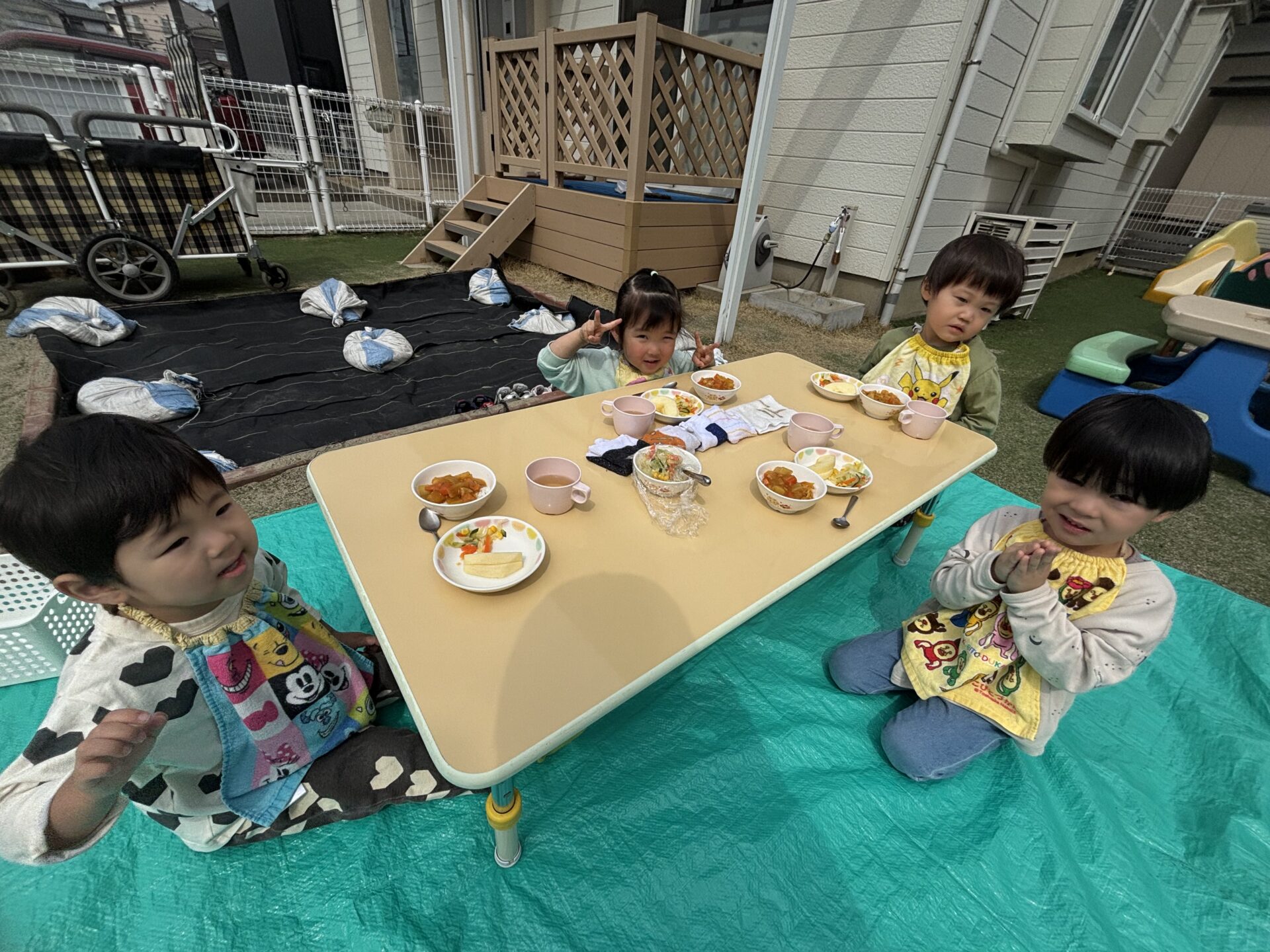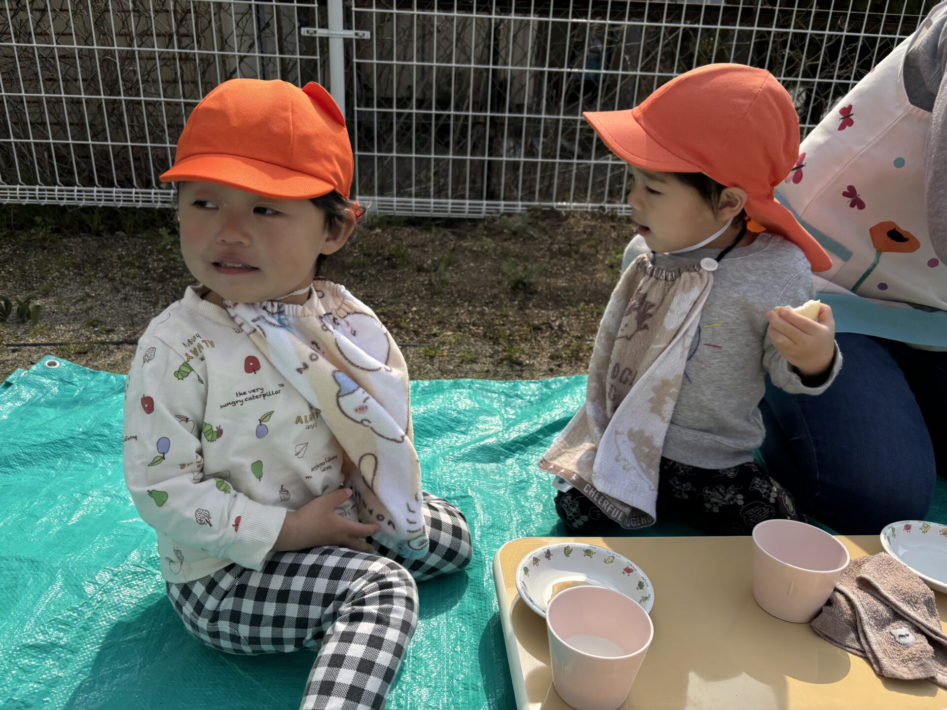 レジャーシートに案内され、初めてのことに戸惑う子どもたち🤭靴を脱いで、シートにちょこんと座っていました。