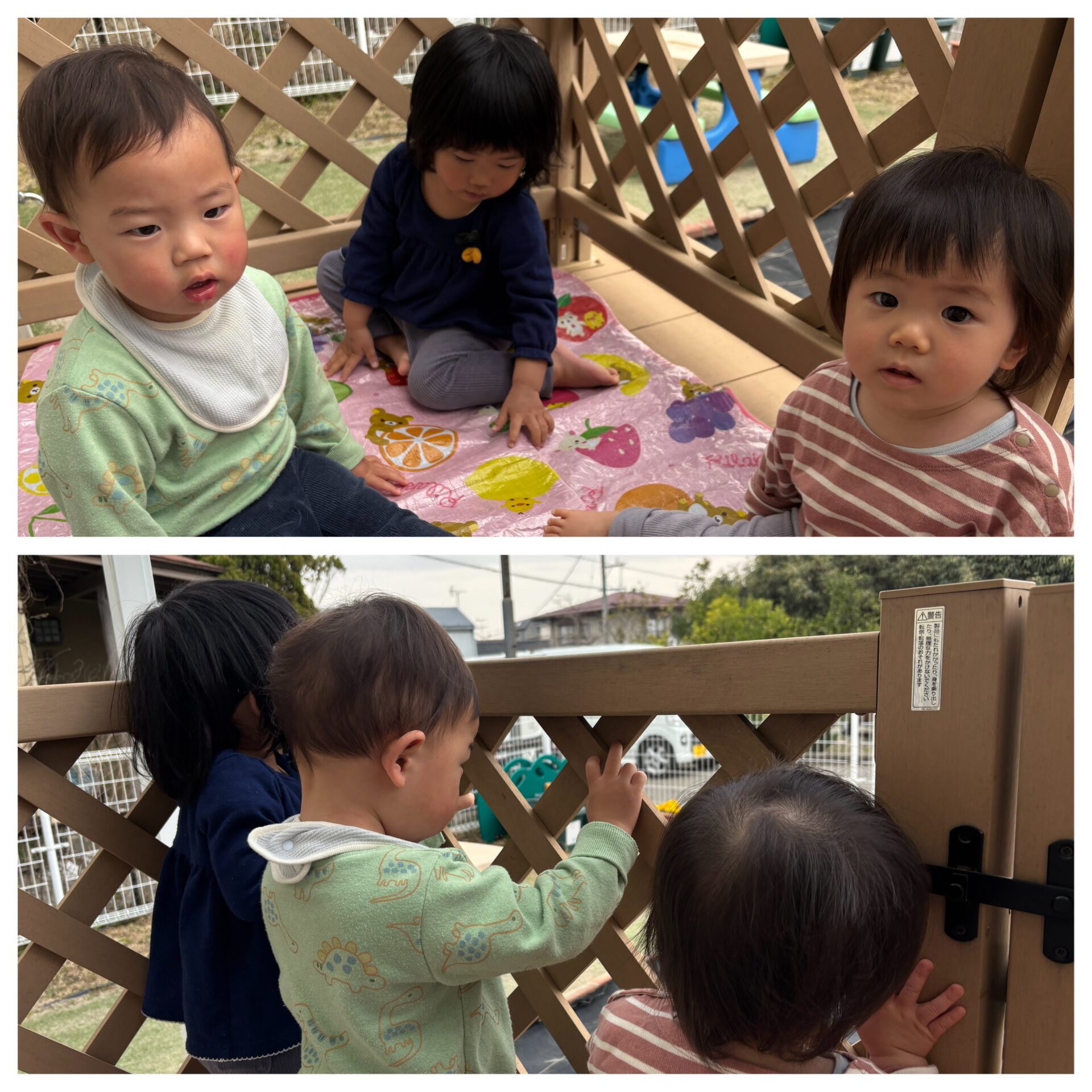 0歳児 すいかグループのお友だち、当日お休みだったお友だちは、テラスピクニックをして楽しみました🥰保育園の前をトラックや働く車が通る様子をじーっと見つめていました👀