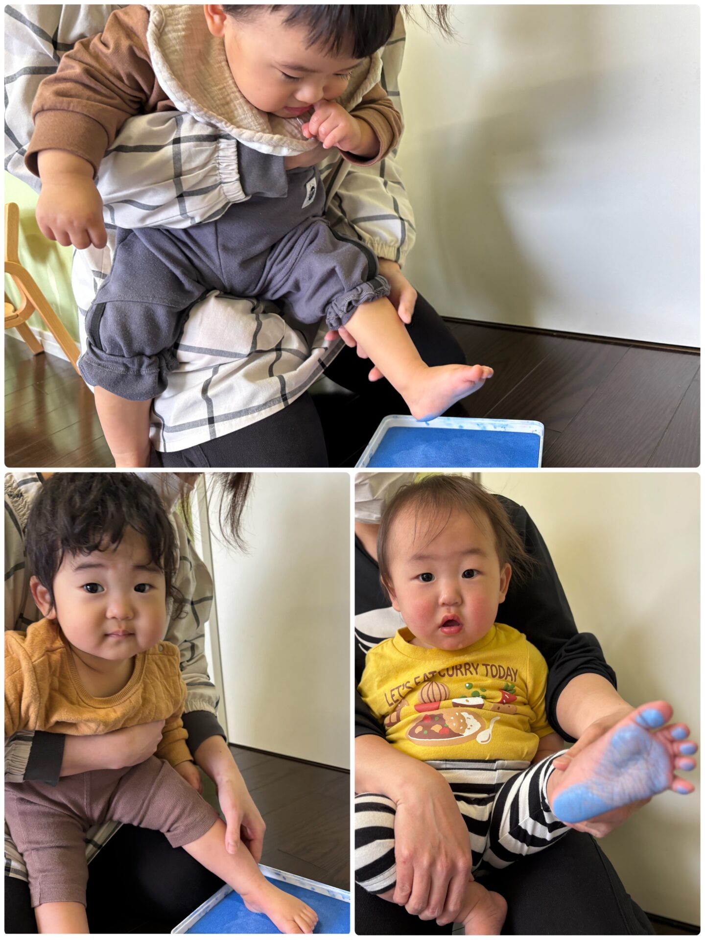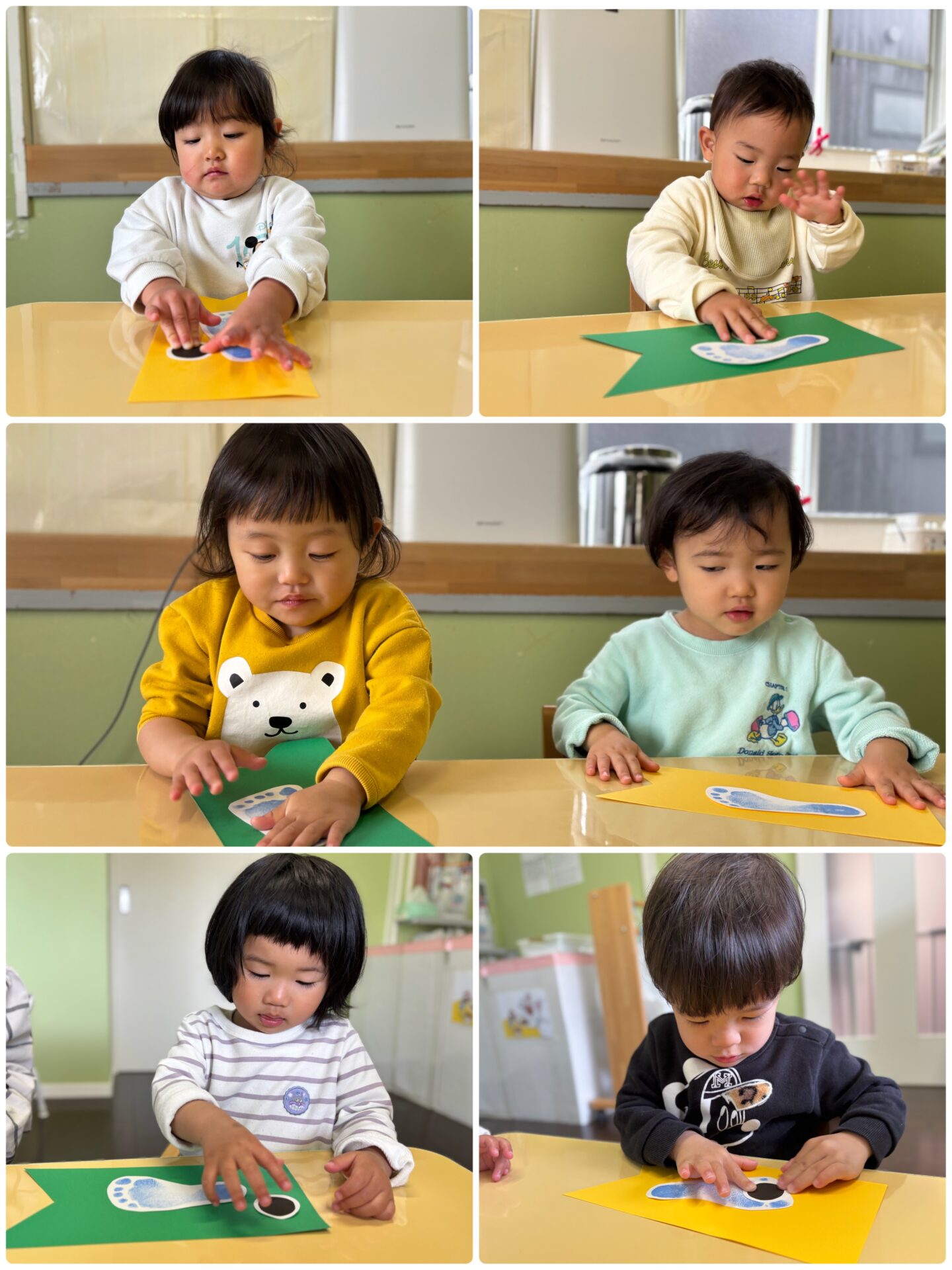 今回の製作では、スタンプで足形を取りました。スタンプ台に足をつけると、足の裏にスタンプの色がつく様子をまじまじと見ていた子どもたちです。