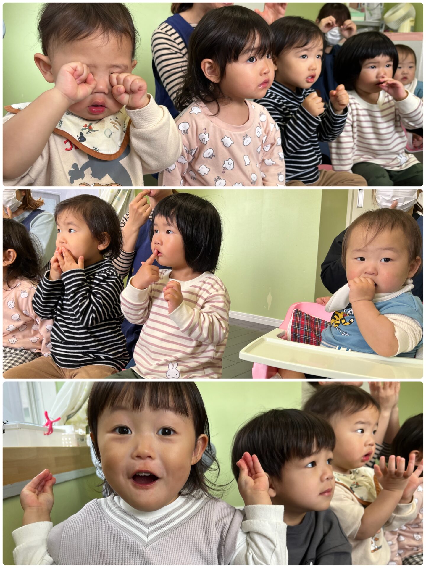 「とんとんとんとん めがねさん〜♪」とうたに合わせて手あそびをしたり、『さんぽ』のリズムで足踏みしたりして、歌うだけでなく、体も動かして楽しみました🤗