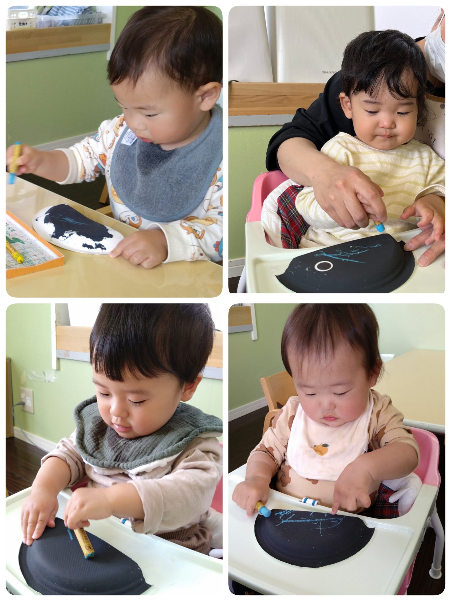 うみグループ(1歳児)は黒く塗ってある紙皿にクレヨンで模様を描きました🖍️クレヨン観察から始める子やすぐに模様描きを楽しむ子もいて、一人ひとりのペースに合わせて楽しみました。