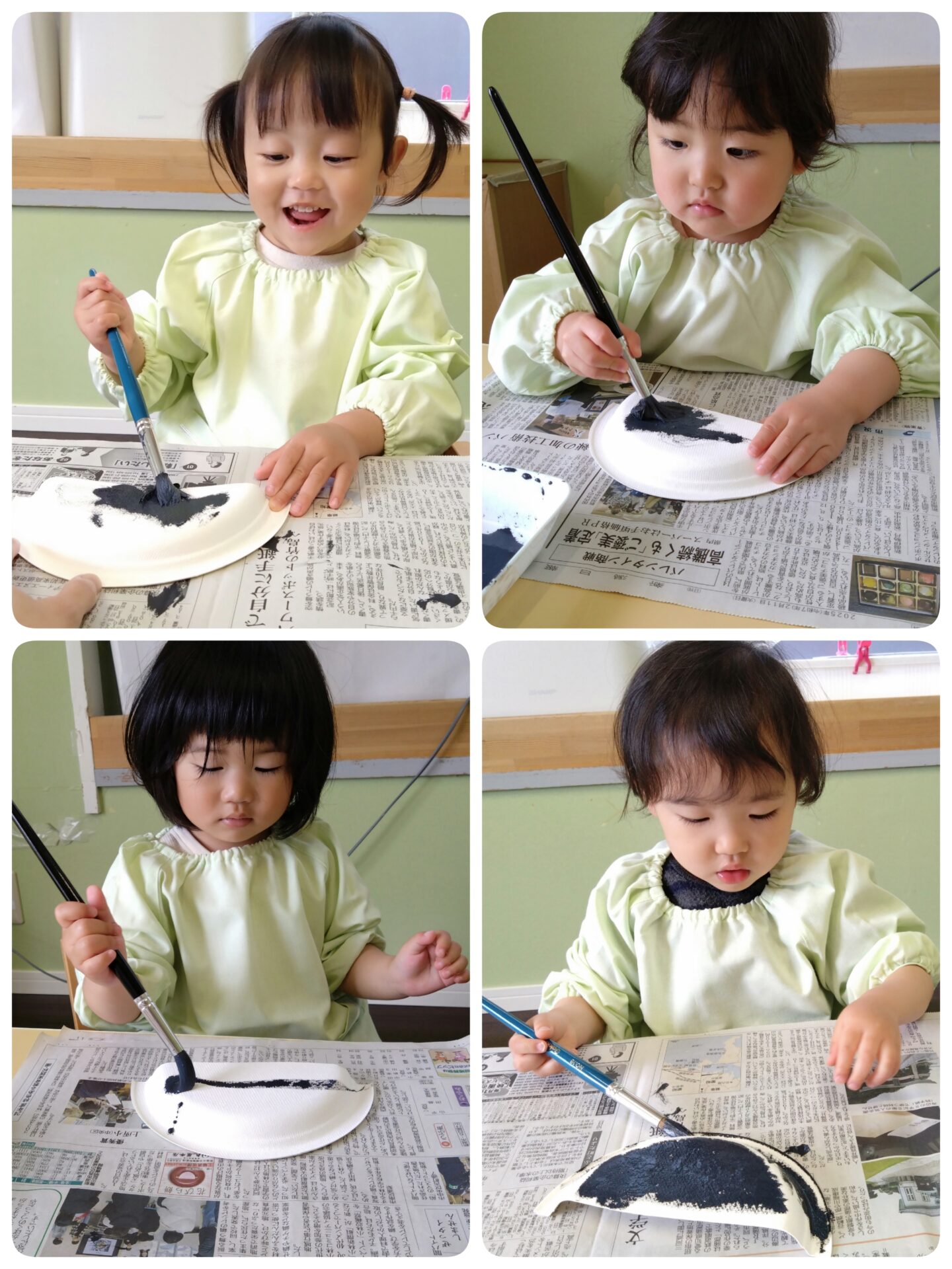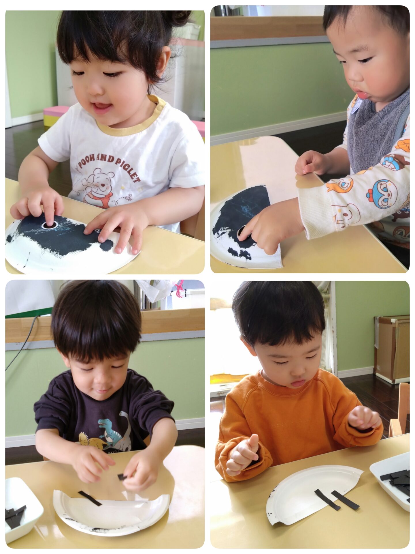 かぜグループ(2歳児)は自分で紙皿に絵の具を塗りました。はじめは黒い色の絵の具を見て、”これは何かな?”と慎重に塗っていた子どもたちですが、白い紙皿に色がついていく様子にすぐ夢中になっていました😊紙皿全体に色を塗ったり中央に重ねて塗ったりなど、塗り方はそれぞれです。