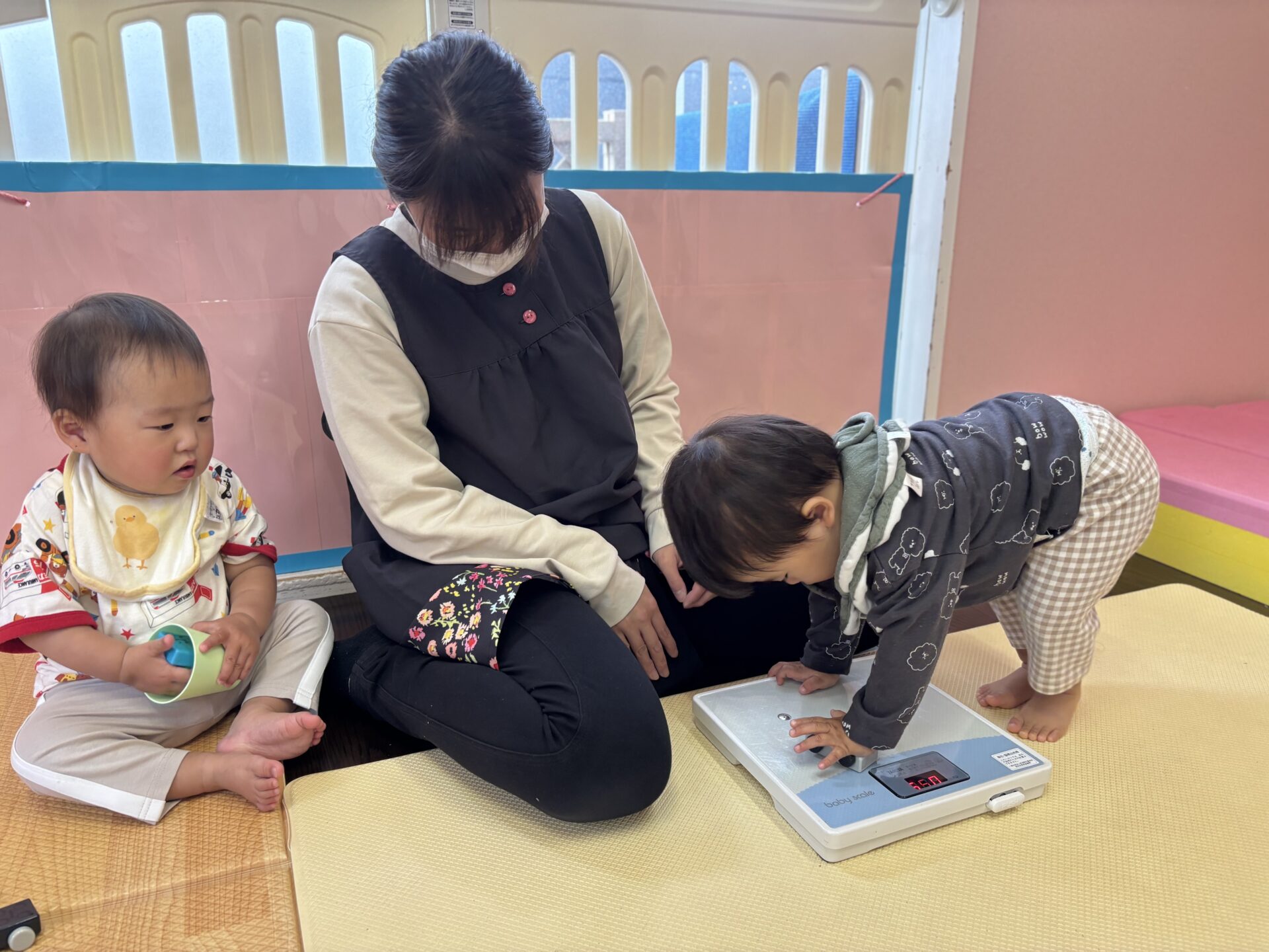 月齢の低い子たちはベビースケールに乗って測りました。