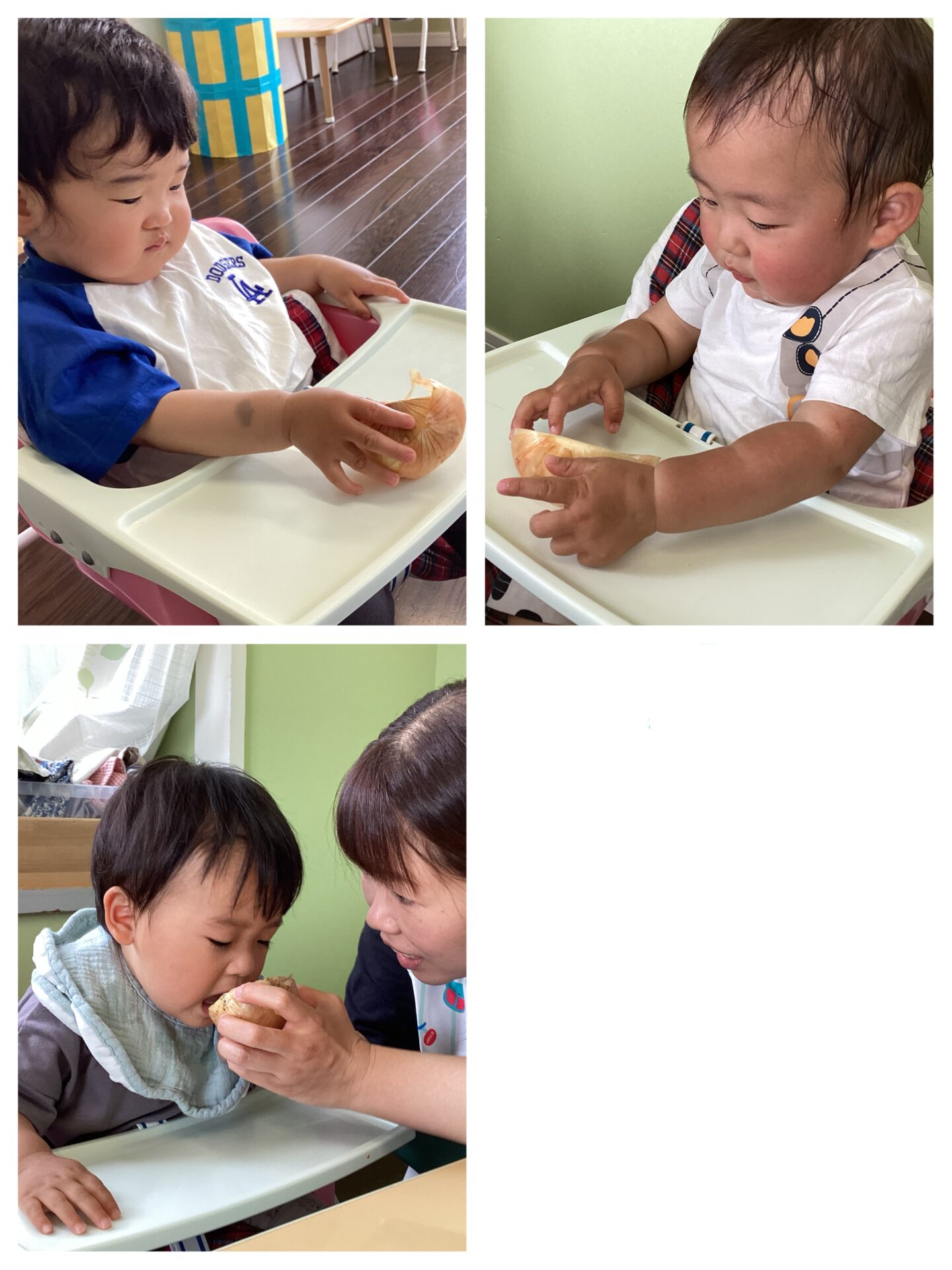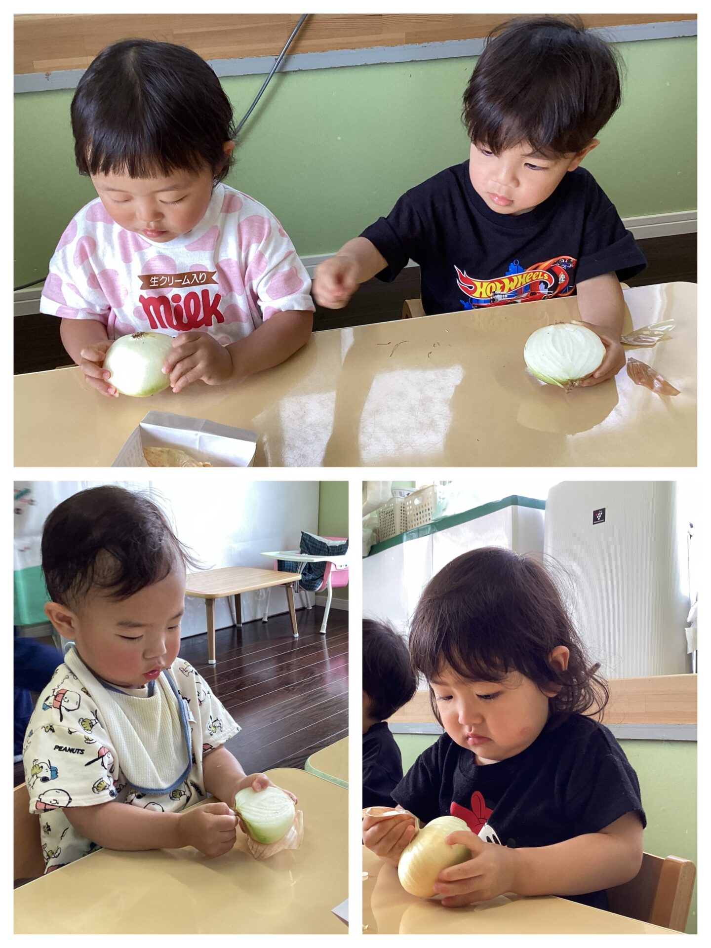初めて玉ねぎを見て、触れたお友だちは、『これは何?』と不思議そうにツンツン触ってみたり☝️匂いをかいだり👃『あーん😃』と大きなお口で食べようとしてみたり…🤭玉ねぎという食べ物がどんなものなのか感じることができました。