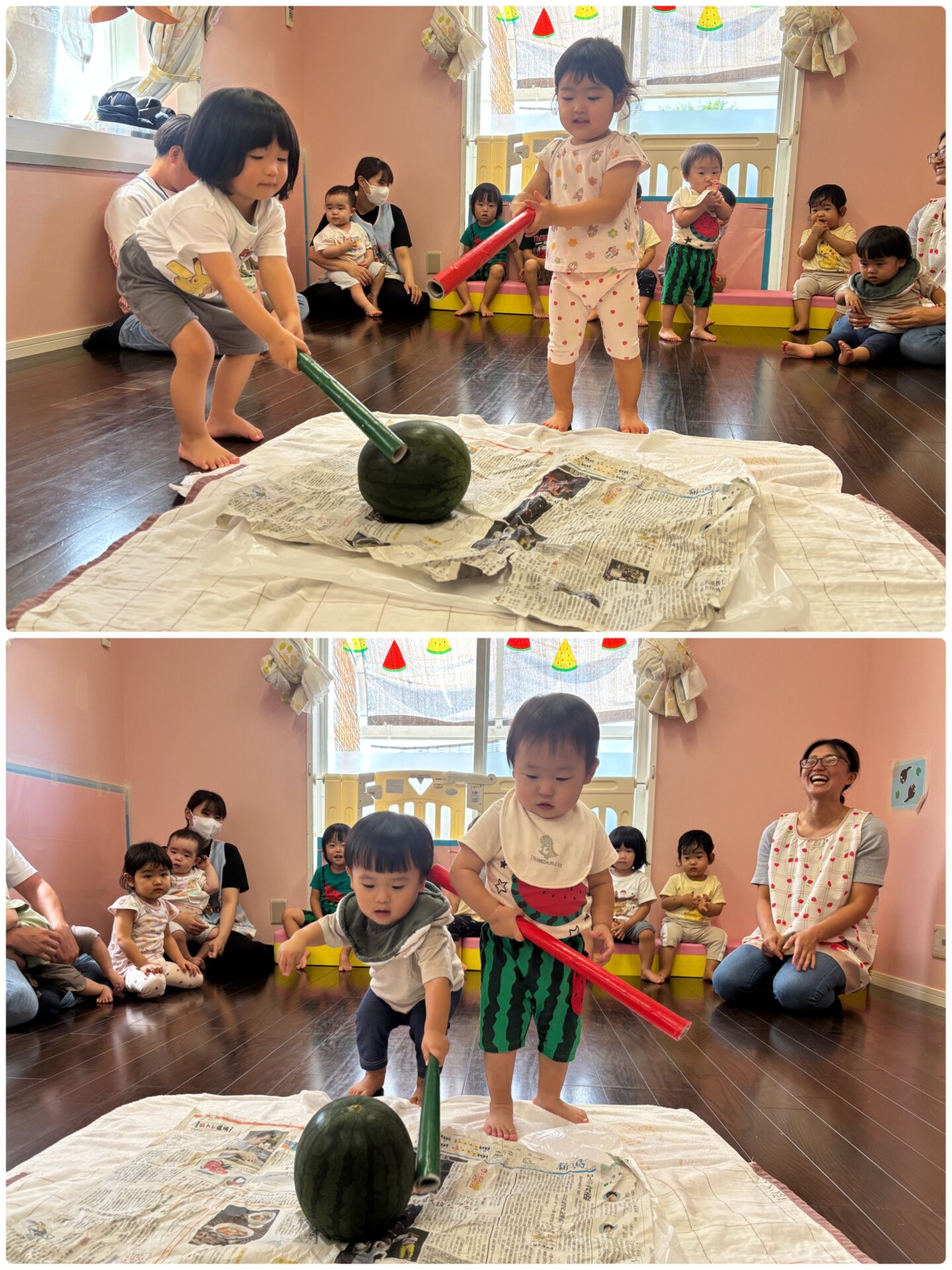 それを見て、うみグループ(1歳児)・すいかグループ(0歳児)の子どもたちも参戦! 保育者と一緒に棒を持ってがんばりましたよ😆