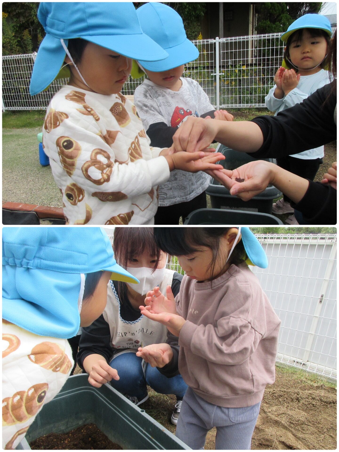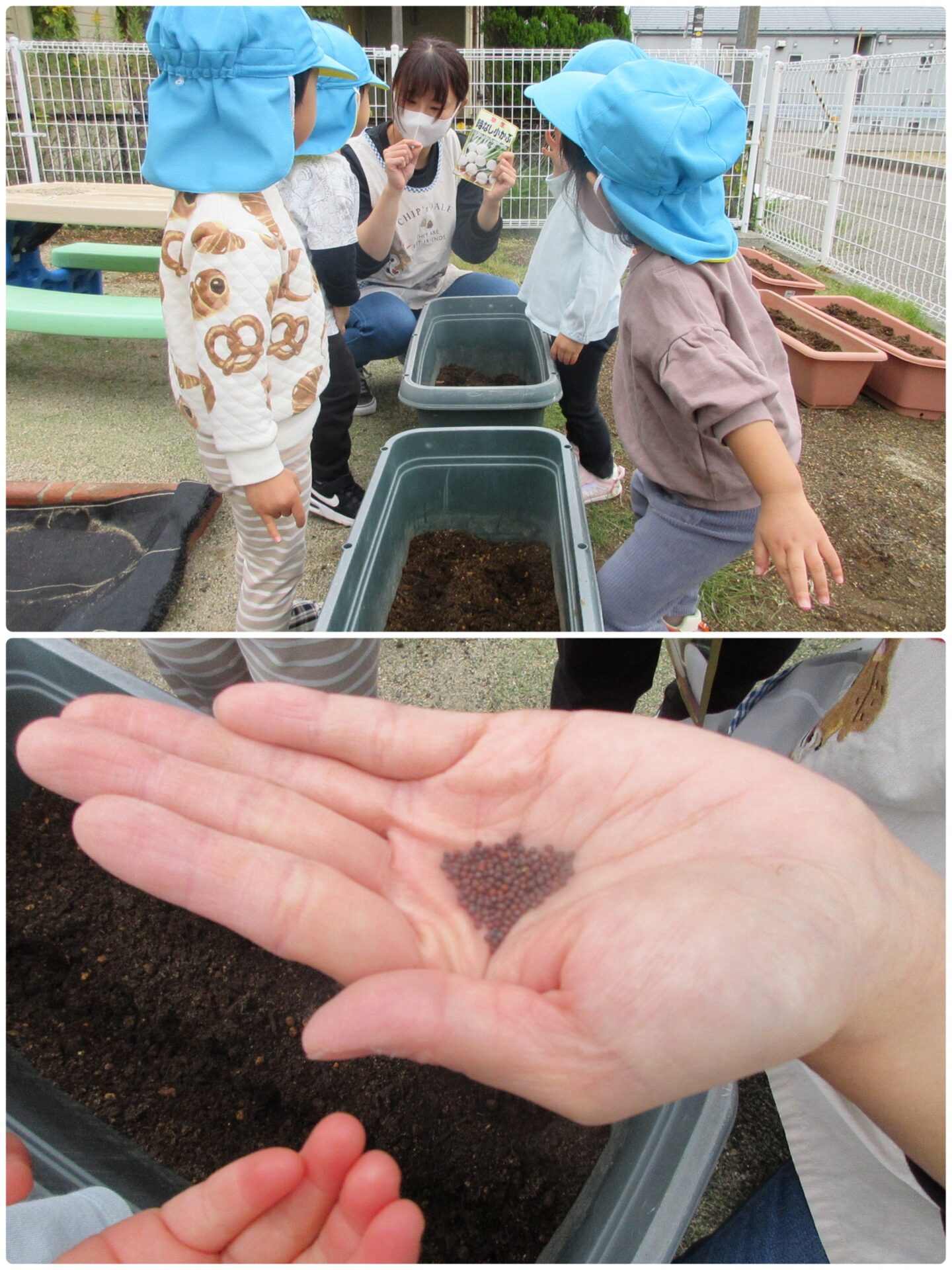 絵本やイラストでカブそのものは見たことがありますが、種はあまり見る機会はないため、興味津々な子どもたち。保育者の手のひらに載せると、丸くて紫色の粒を見て、「ブドウみたい」と言っていました☺️