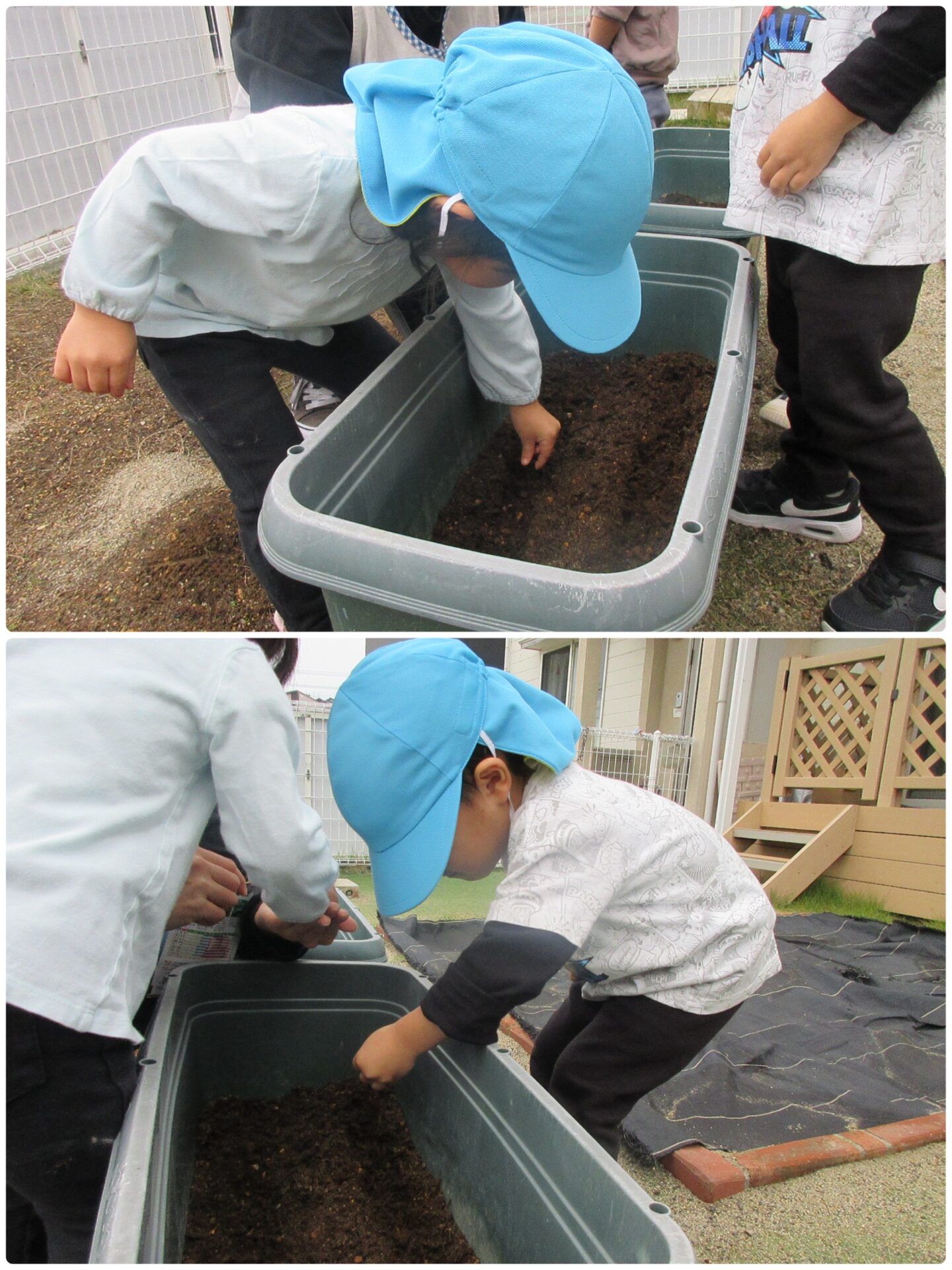 先日、かぜグループ(2歳児)のお友だちがカブの種をまきました。カブの種は、先日かぜグループさんがホームセンターに行って買ってきました。「お買い物で何を買ったかな?」と保育者が聞くと「種!」としっかり覚えていましたよ。