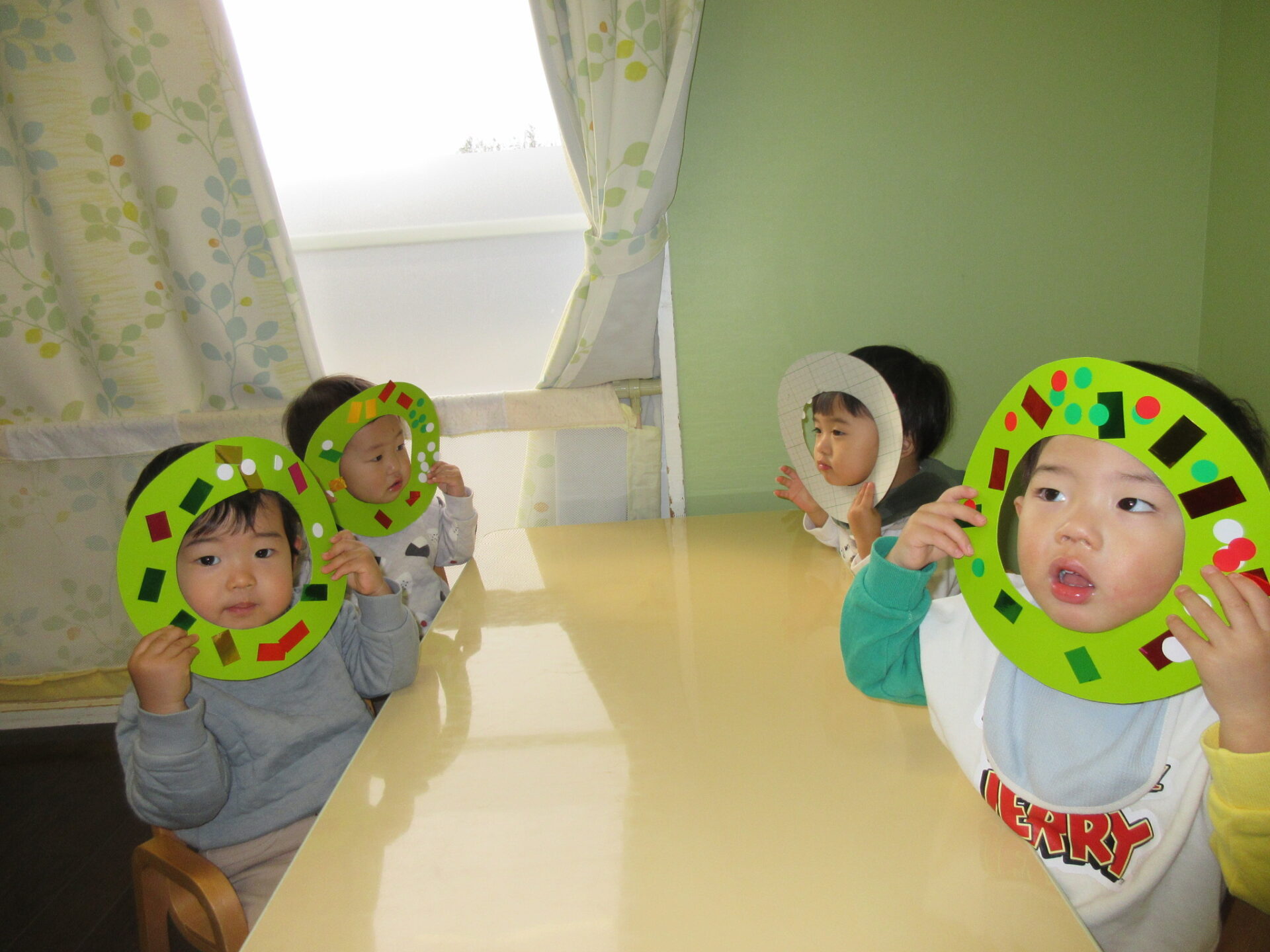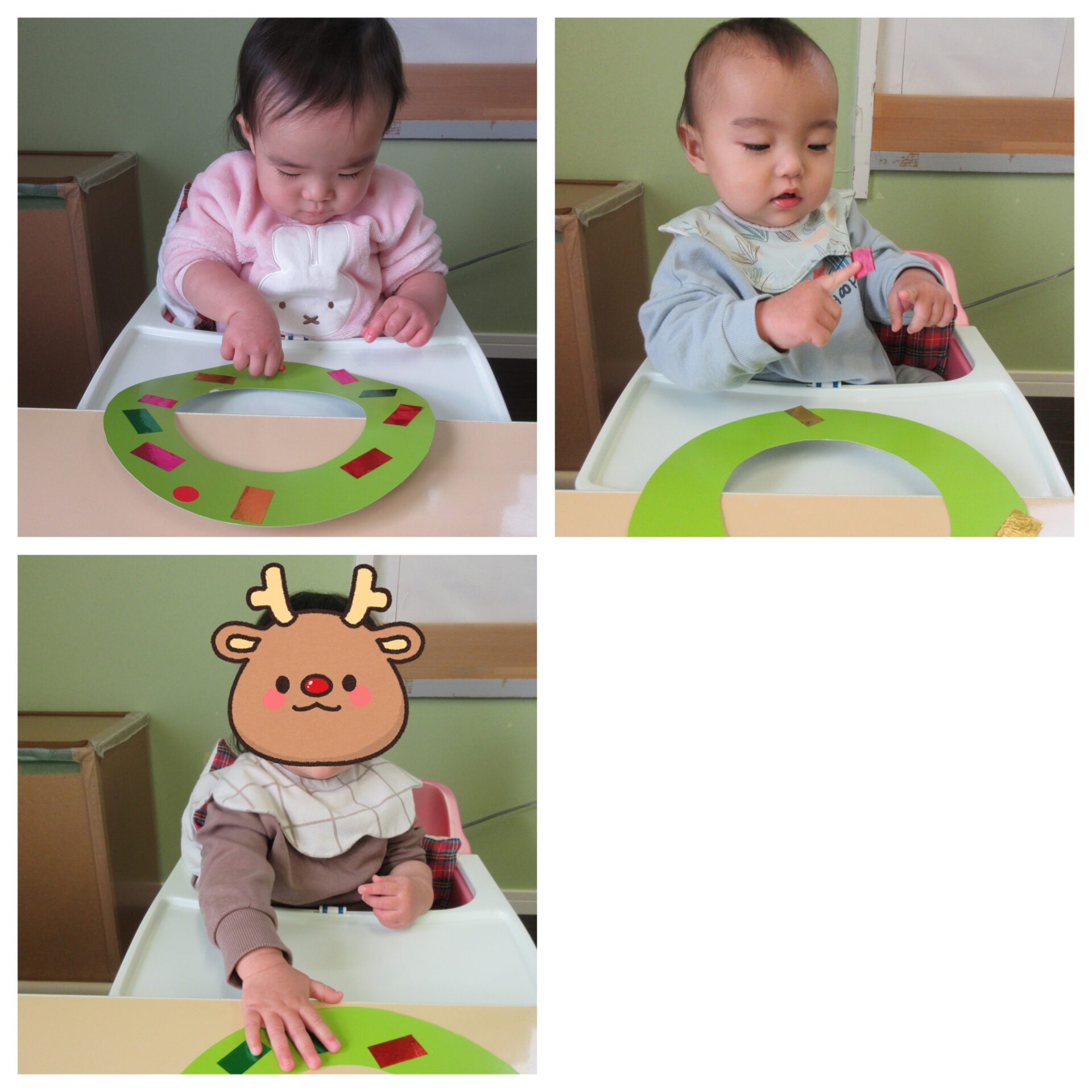 リースにはキラキラのテープと丸シールを付けました。0歳児すいかグループは保育者と一緒に、1歳児うみグループは手伝ってもらいながら自分で飾り付けました。指先が器用になってきて成長を感じます☺️