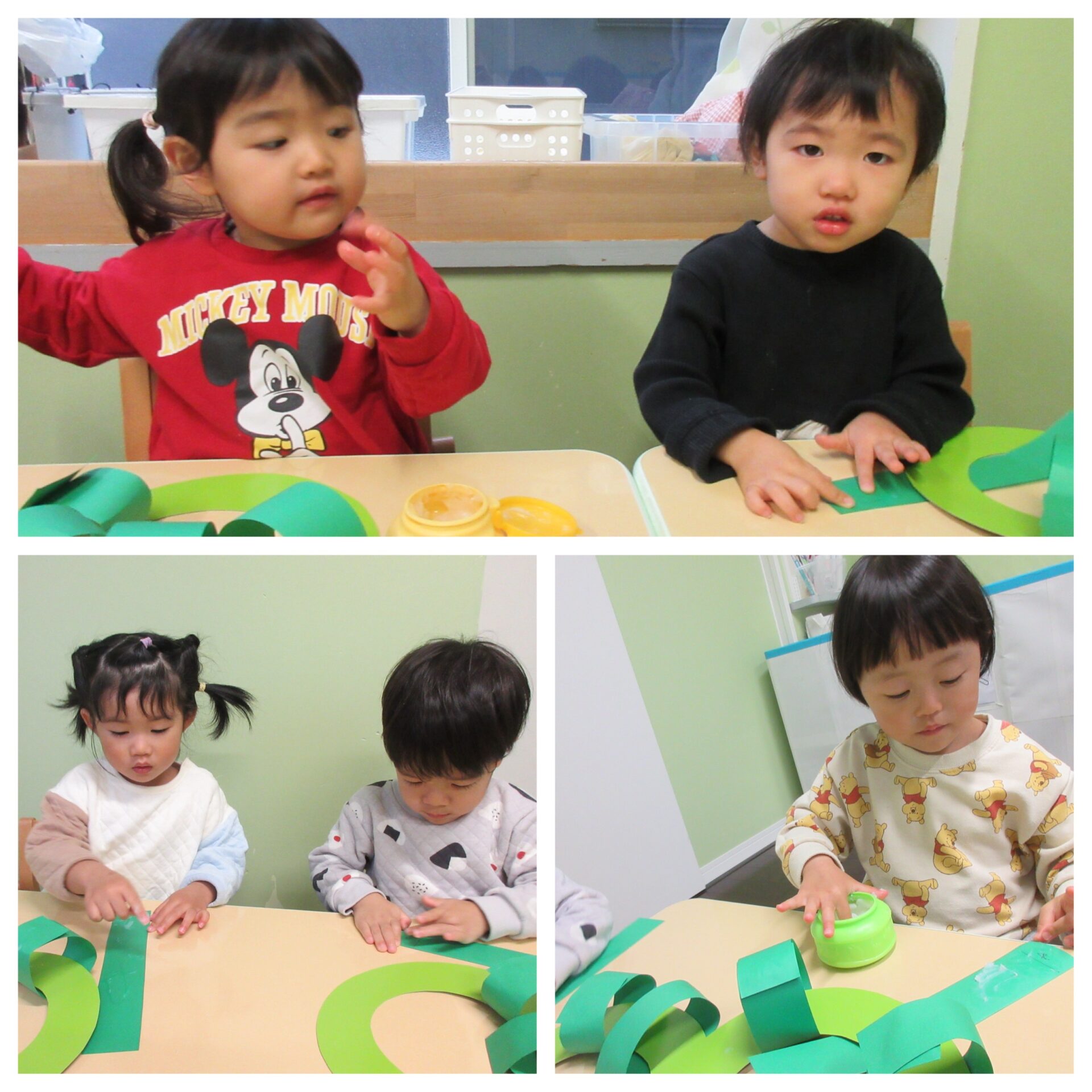 2歳児かぜグループは、シールを貼るほかに、緑の画用紙を輪にしてのりで貼りつける《輪つなぎ》にも挑戦しました。のりはどのくらい付けると良いかな?どこをくっつけると輪ができるかな?と一つひとつ考えながら手先を動かしていました。なかなか難しい作業ですが、最後まで集中して取り組んでいたかぜグループさんです!