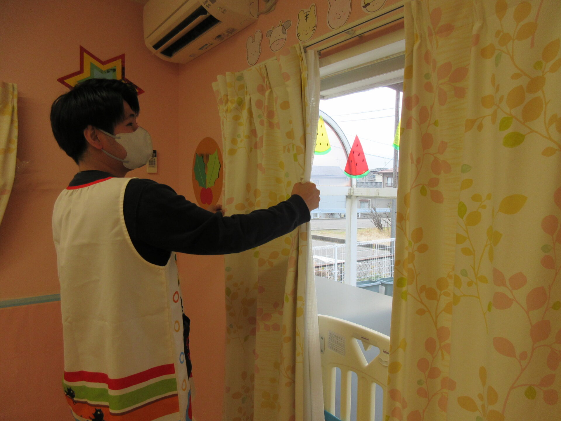 子どもたちに不安を与えないよう配慮しながら、子どもたちと一緒に避難する、個室の前で待機する、外を確認するなど、役割を分担して同時進行で対応していきます。