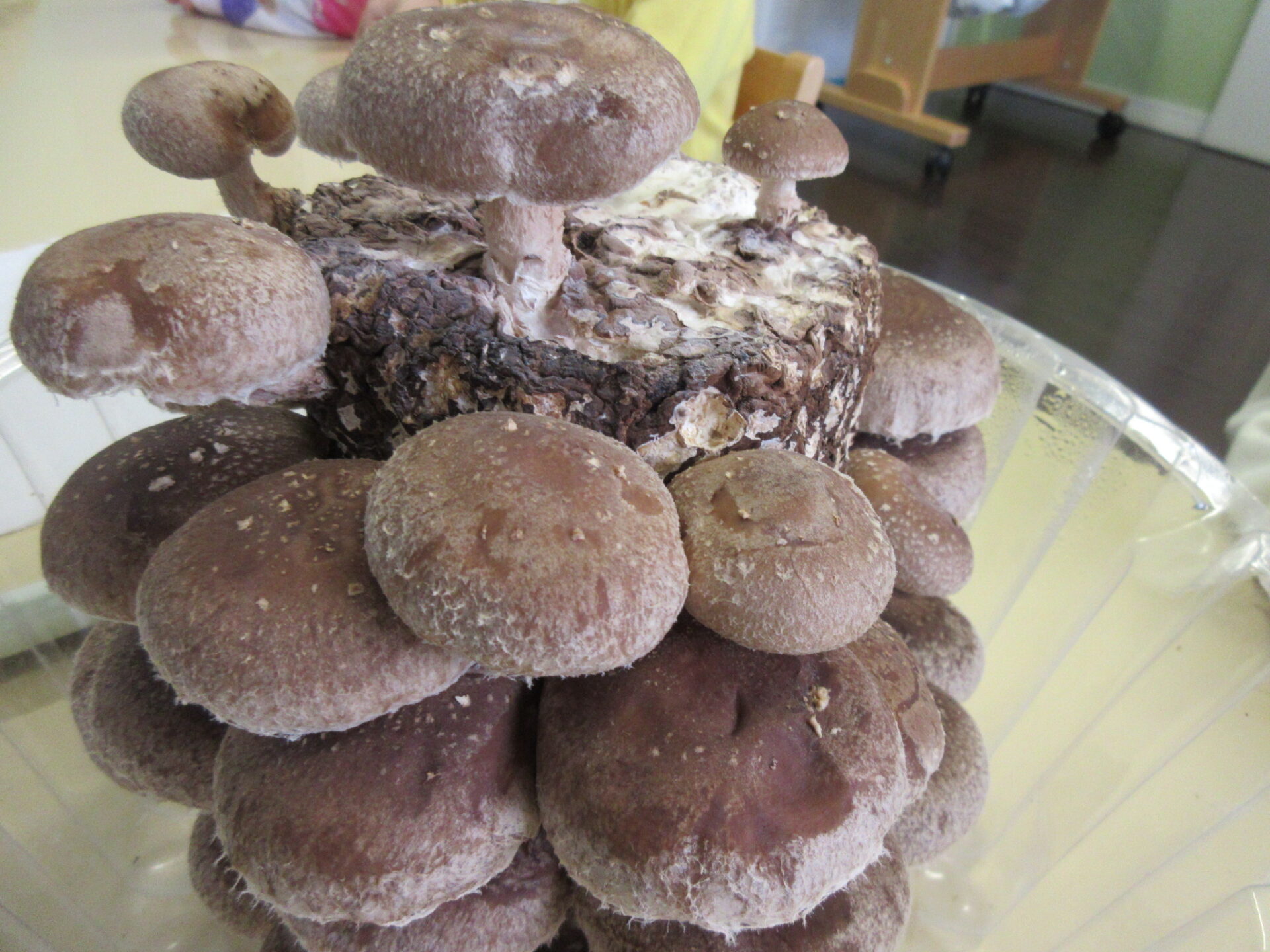 ピンクちゃんは元気いっぱいで、収穫当日の朝、保育者がザッと数えたところ、一人2〜3個持って帰れるくらいあるかも?!というくらい沢山のしいたけが出来ていました。