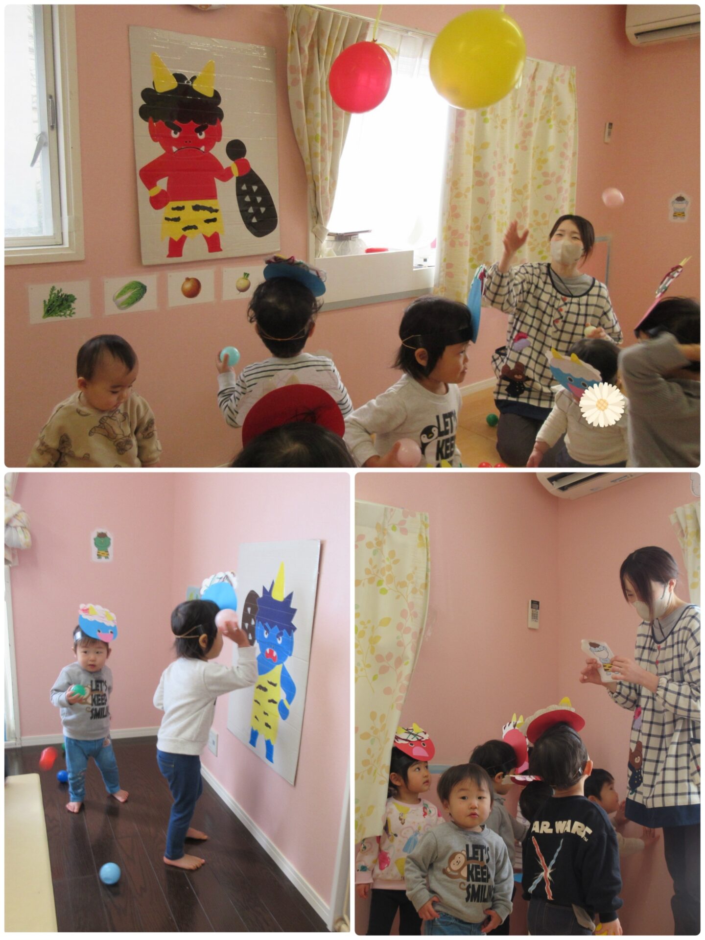 お部屋の壁や風船の鬼に向かって豆に見立てたボールを投げました。保育室内のあちこちにいる鬼を探しながら、大きな鬼にたくさんボールを当てる子や高い所にいる鬼に狙いを定めて投げる子など、子ども達それぞれが鬼退治に夢中になっていました。